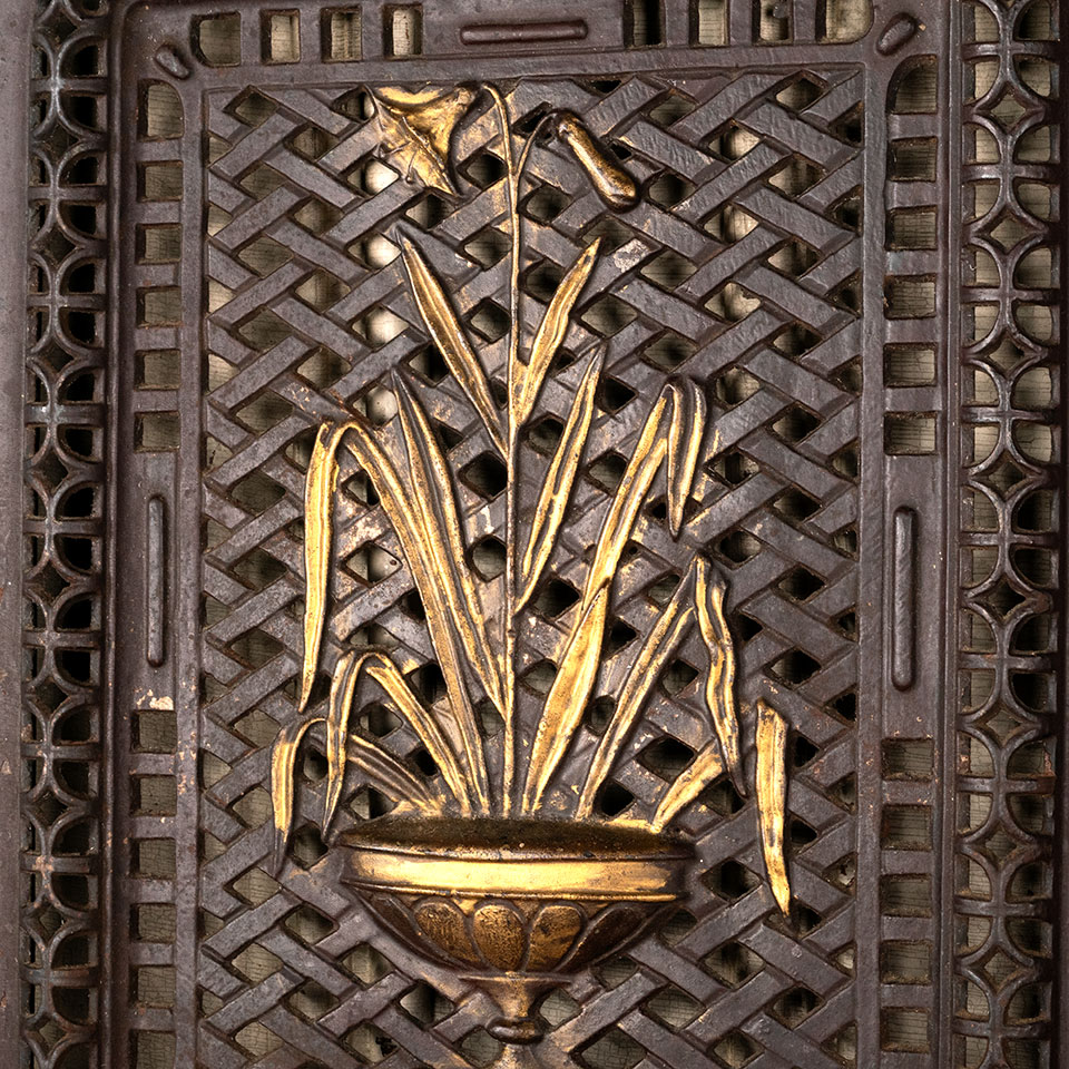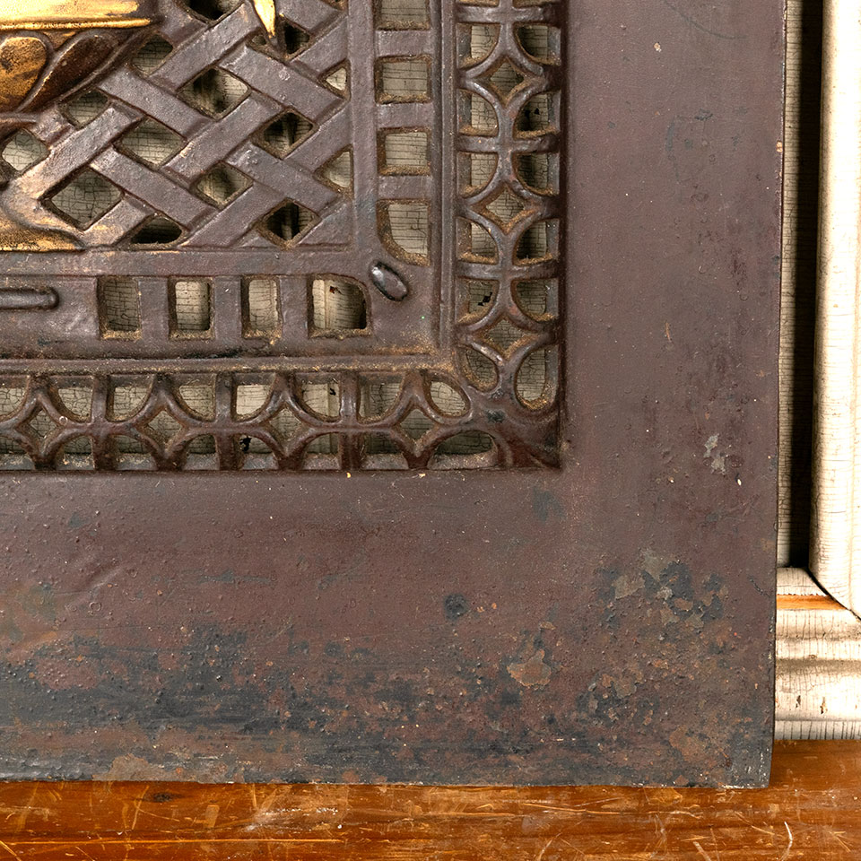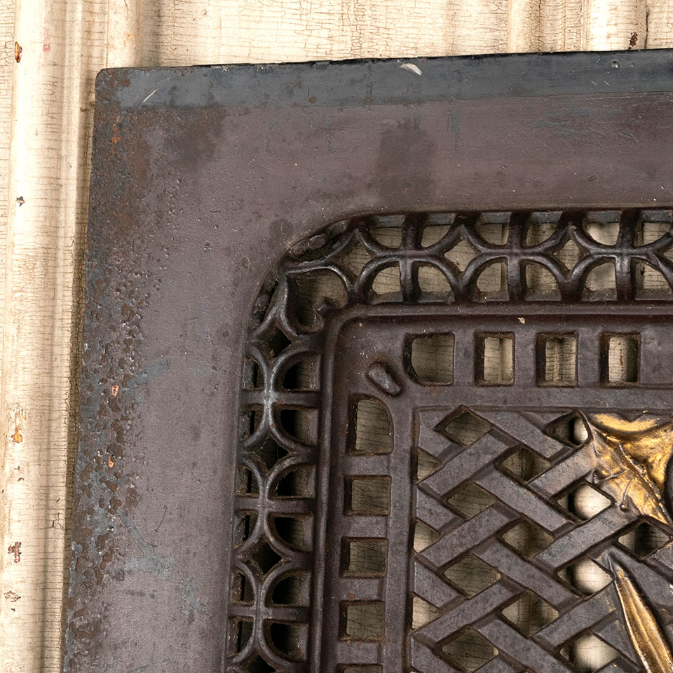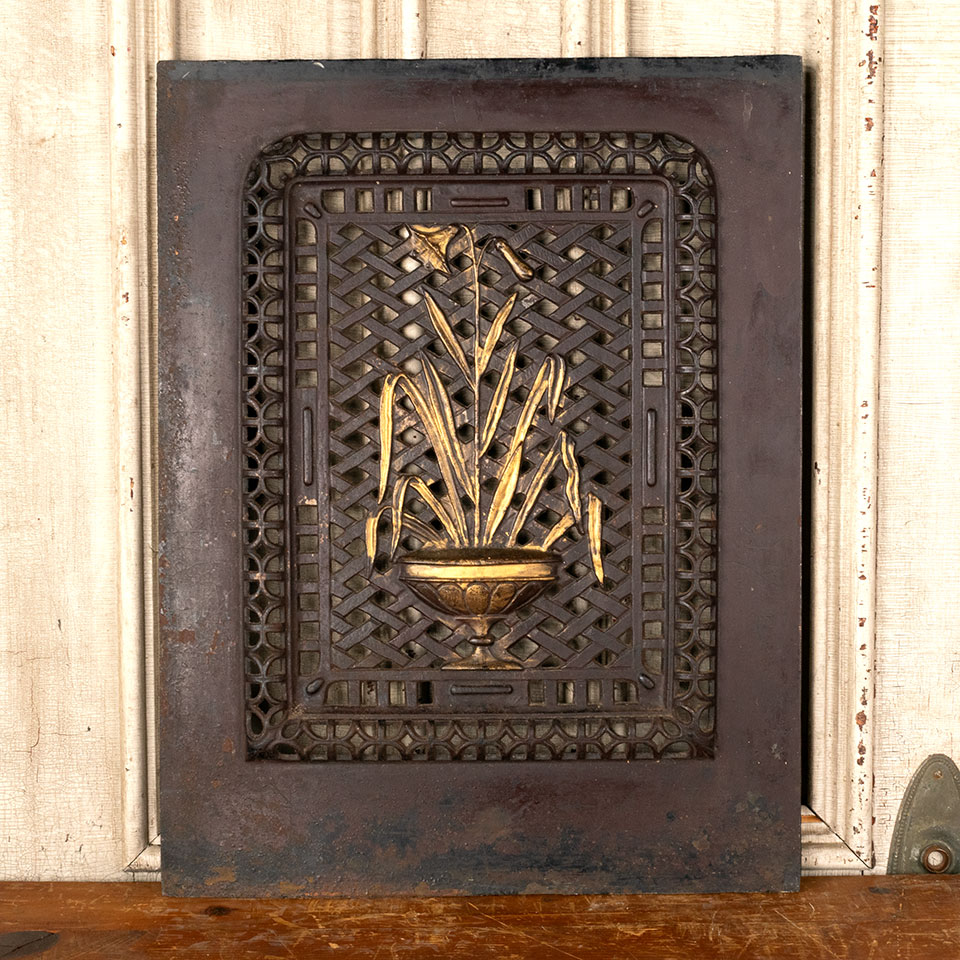 Antique architectural salvage ornate cast iron fireplace summer front cover with flower and urn in high relief measuring approx. 19 7/8" wide x 25 7/8" tall x 3/4" front to back. See photos to evaluate condition.