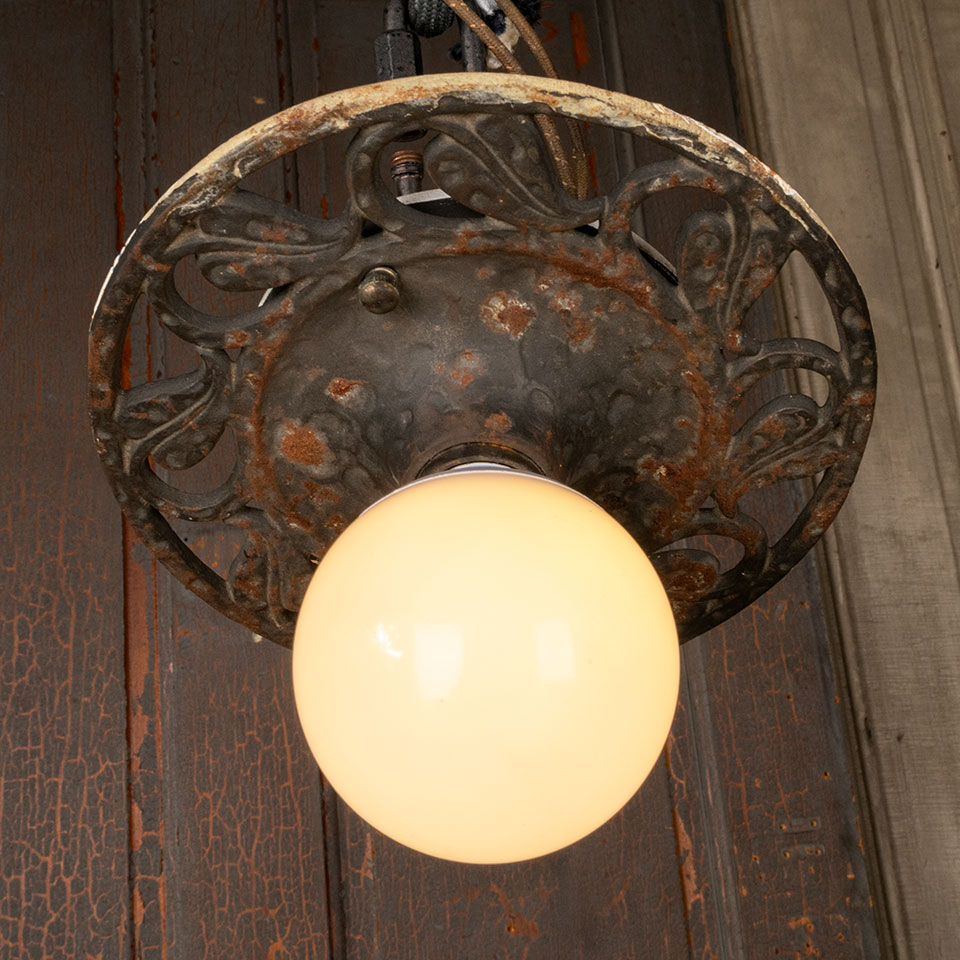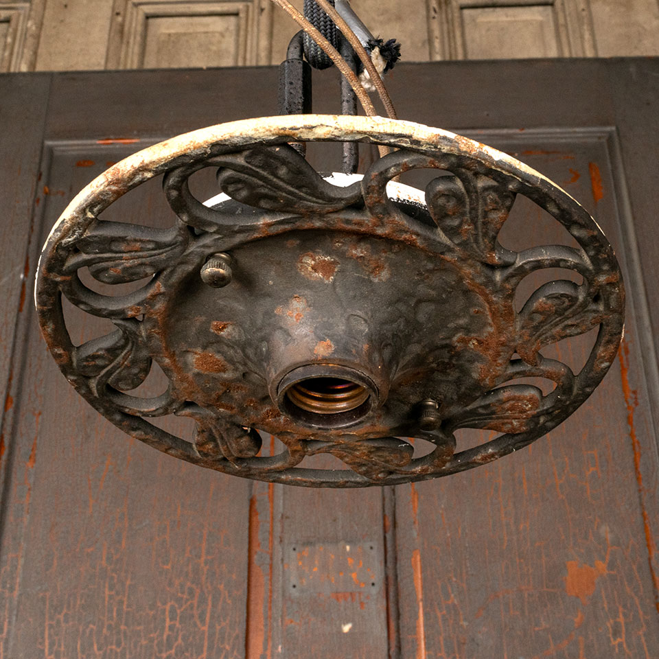 Antique architectural salvage flush mount cast metal single light chandelier measuring approx. 8" in diameter x 1 3/4" tall. See photos to evaluate condition. Salvaged lighting should be tested by an electrician prior to installation. Priced at $65/each.
