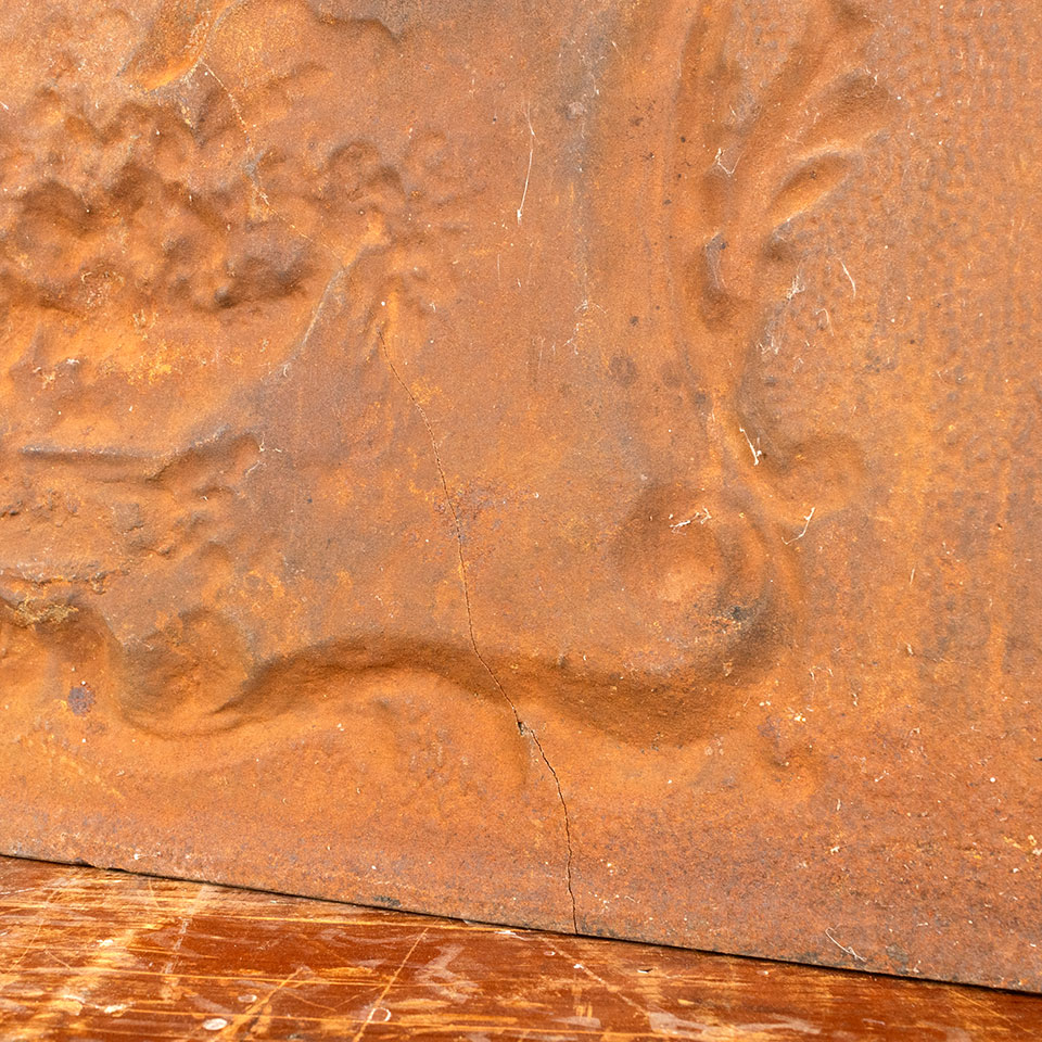 Antique architectural salvage ornate high relief cast iron fireplace summer front cover with figural motif measuring approx. 20 1/8" wide x 25 5/8" tall x 2 1/2" front to back. There's a crack at the bottom of this piece, but it doesn't affect the structural integrity of the piece. See photos to evaluate condition.