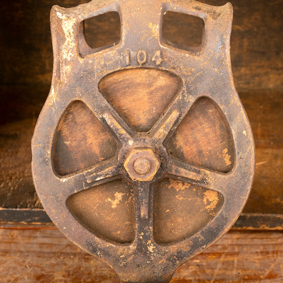 Antique architectural salvage cast iron and wood barn pulley measuring approx. 5" wide x 11" tall x 2 1/2" front to back. See photos to evaluate condition.
