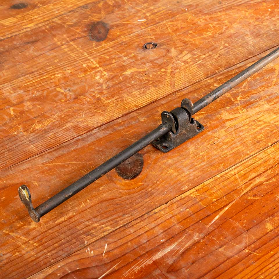 Architectural salvage antique transom window operator measuring approx. 1" wide x 60 3/4" tall. The adjustment arm measures approx. 10 3/4" long and the mounting bracket measures approx. 1 1/8" wide x 2 1/2" tall with a projection of 4 7/8". Color and condition may vary.