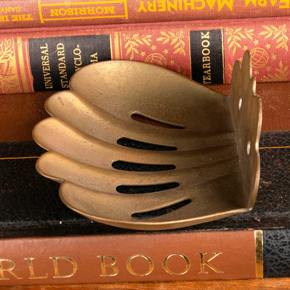 Architectural salvage antique brass scalloped shell wall mount soap dish measuring approx. 4 3/8" wide x 1 3/4" x 3 1/8" front to back. See photos to evaluate condition.