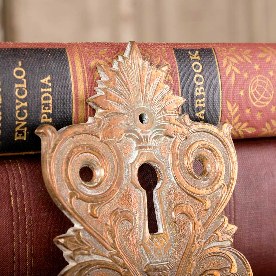 Architectural salvage antique ornate cast bronze skeleton keyhole escutcheon cover plate door hardware measuring approx. 2 1/4" wide x 3 3/4" tall x 1/8" thick. See photos to evaluate condition.