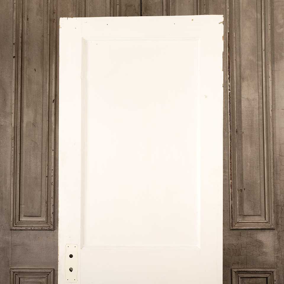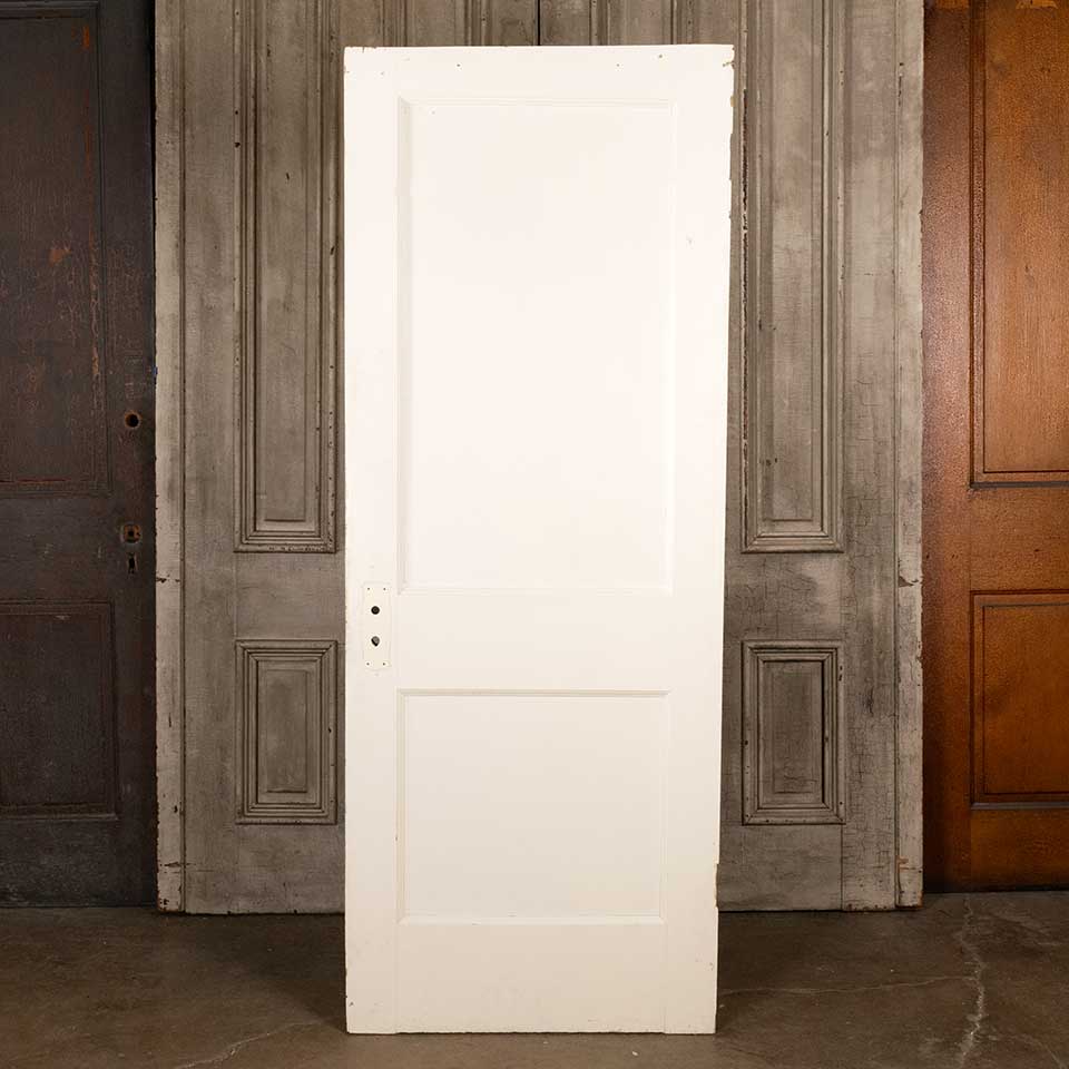 Architectural salvage antique two panel painted wood interior door measuring approx. 29 3/4" wide x 77 1/4" tall x 1 3/8" thick. See photos to evaluate condition.