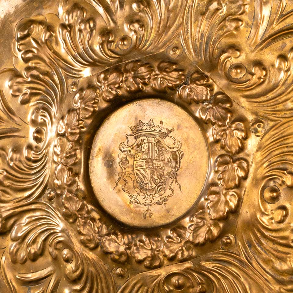 Antique stamped brass charger wall art plaque measuring approx. 20 3/4" in diameter x 2" front to back. There are some holes in the piece. See photos to evaluate condition.