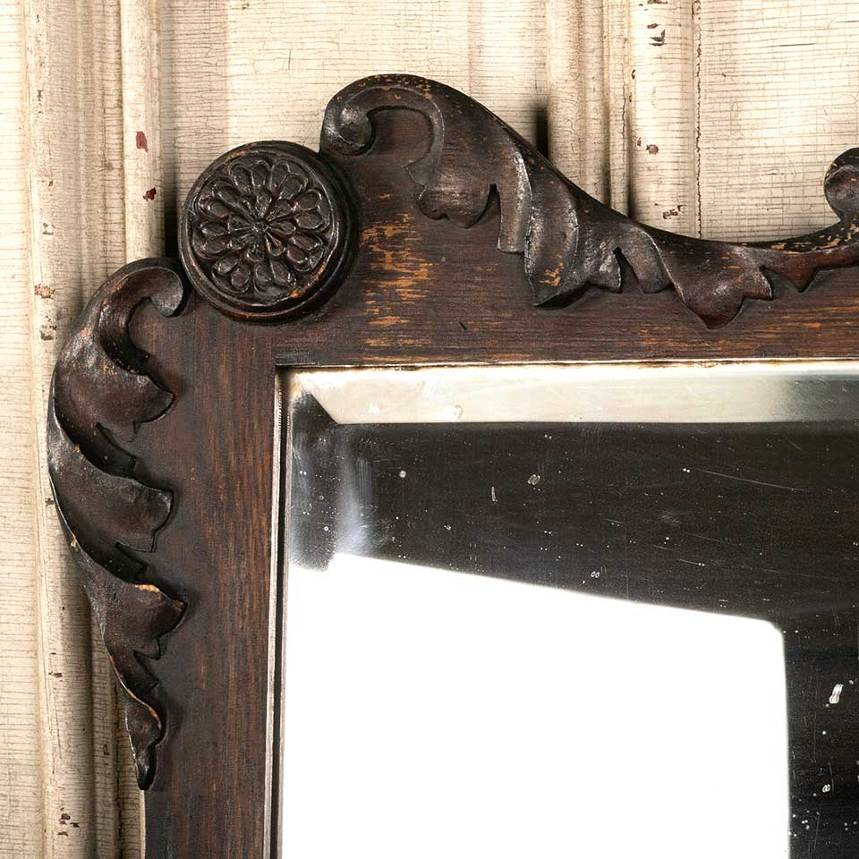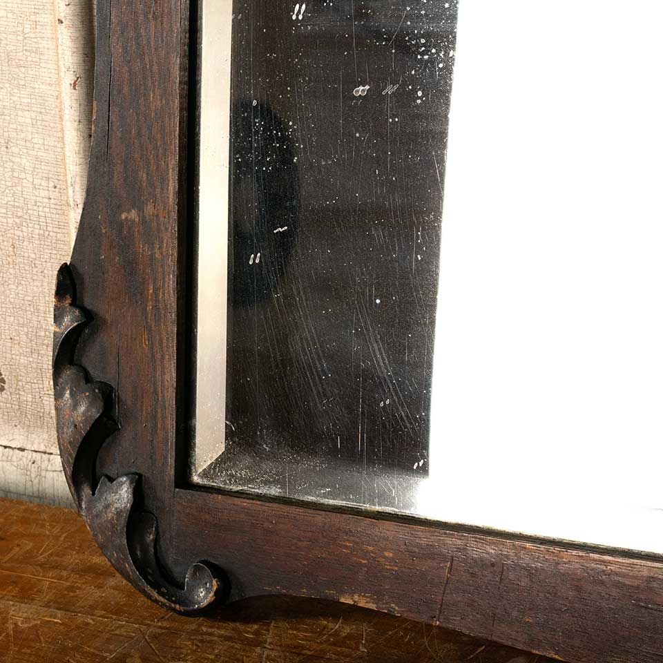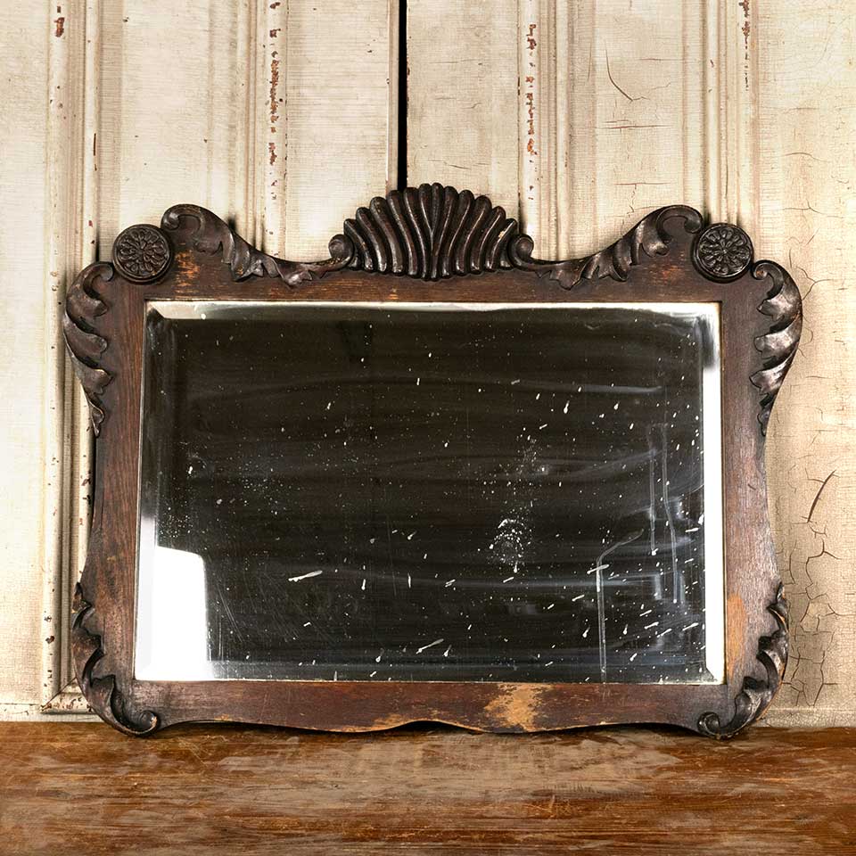 Architectural salvage antique beveled glass mirror in wood frame measuring approx. 30" wide x 23" tall x 1 3/4" front to back. See photos to evaluate condition.