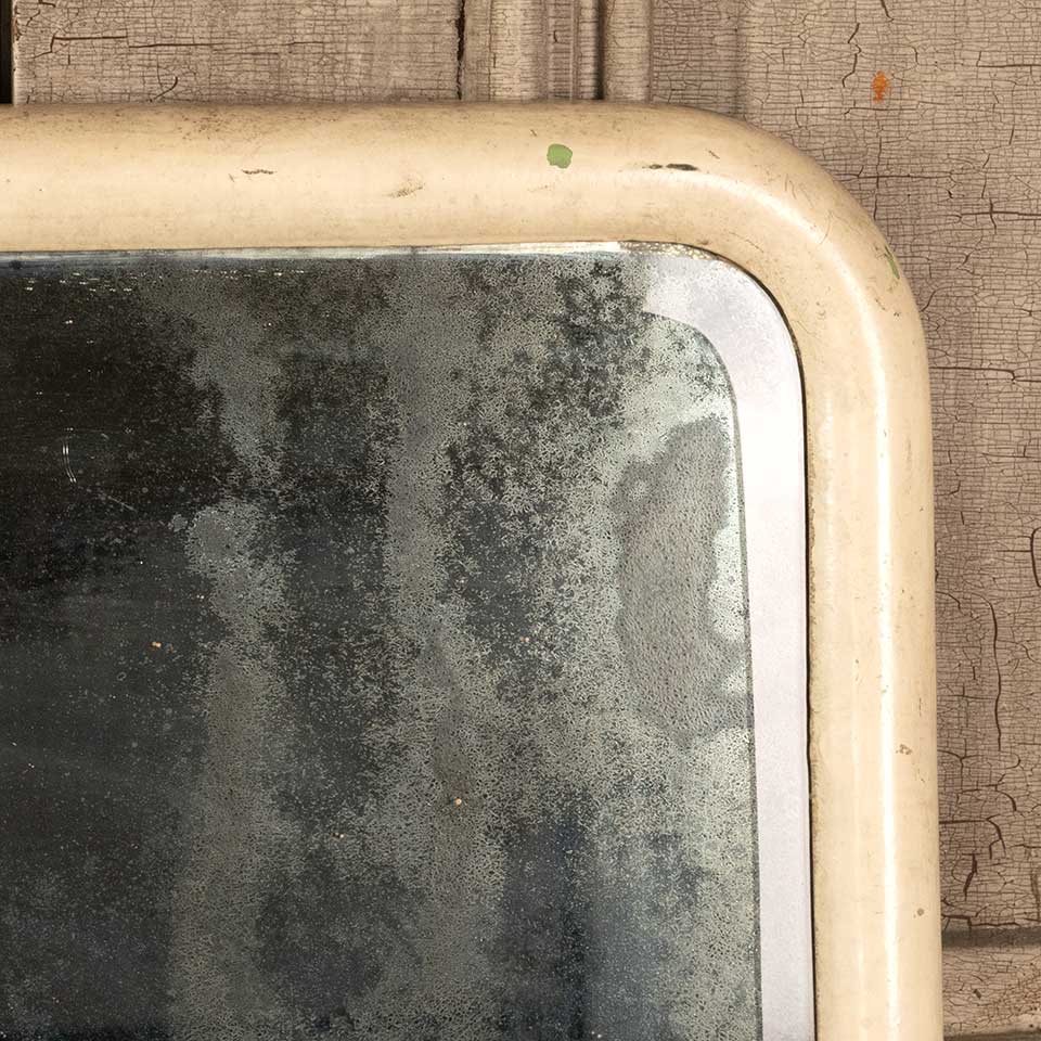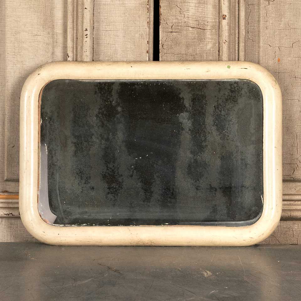Antique beveled glass mirror in painted wood frame with round corners measuring approx. 20 3/8" wide x 14 3/8" tall x 1" front to back. See photos to evaluate condition.