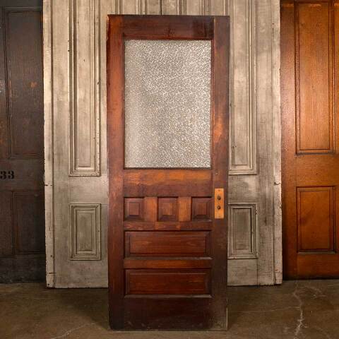 Architectural salvage antique divided half lite wood door with opaque textured Florentine glass measuring approx. 30 1/16" wide x 78 1/8" tall x 1 3/8" thick. See photos to evaluate condition.