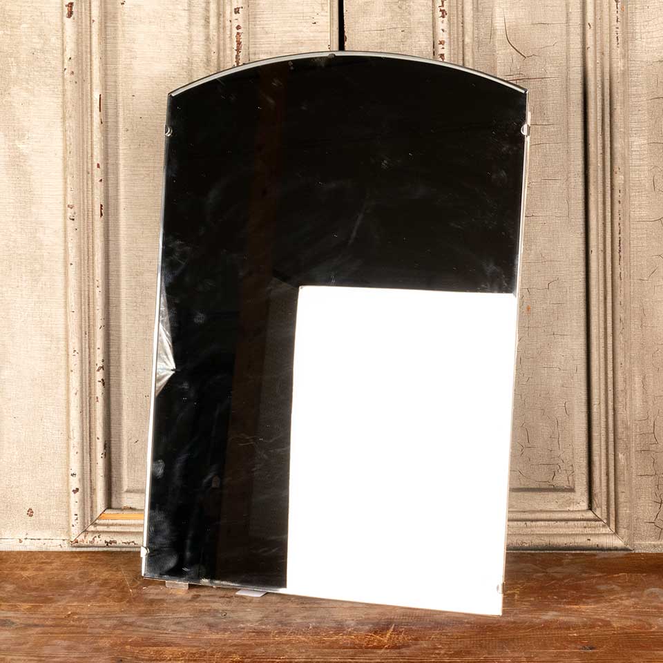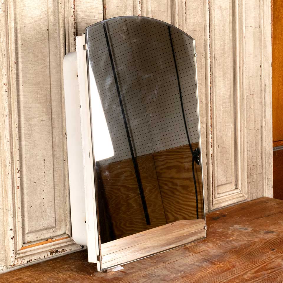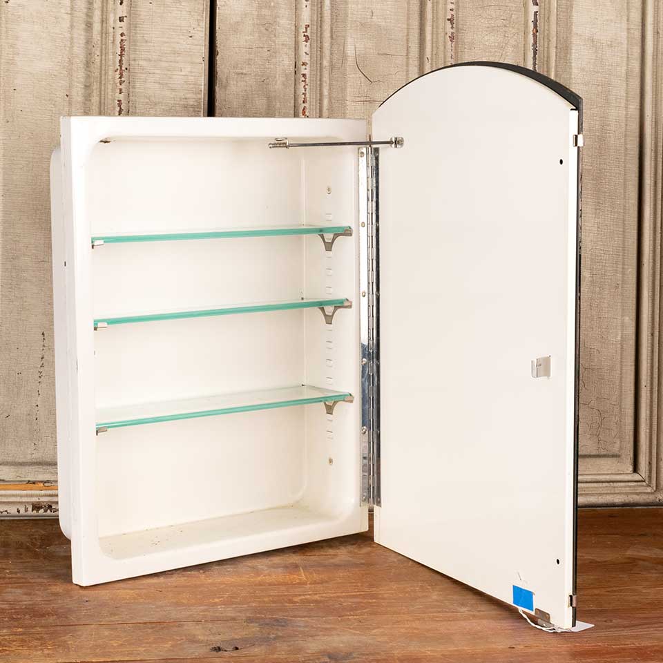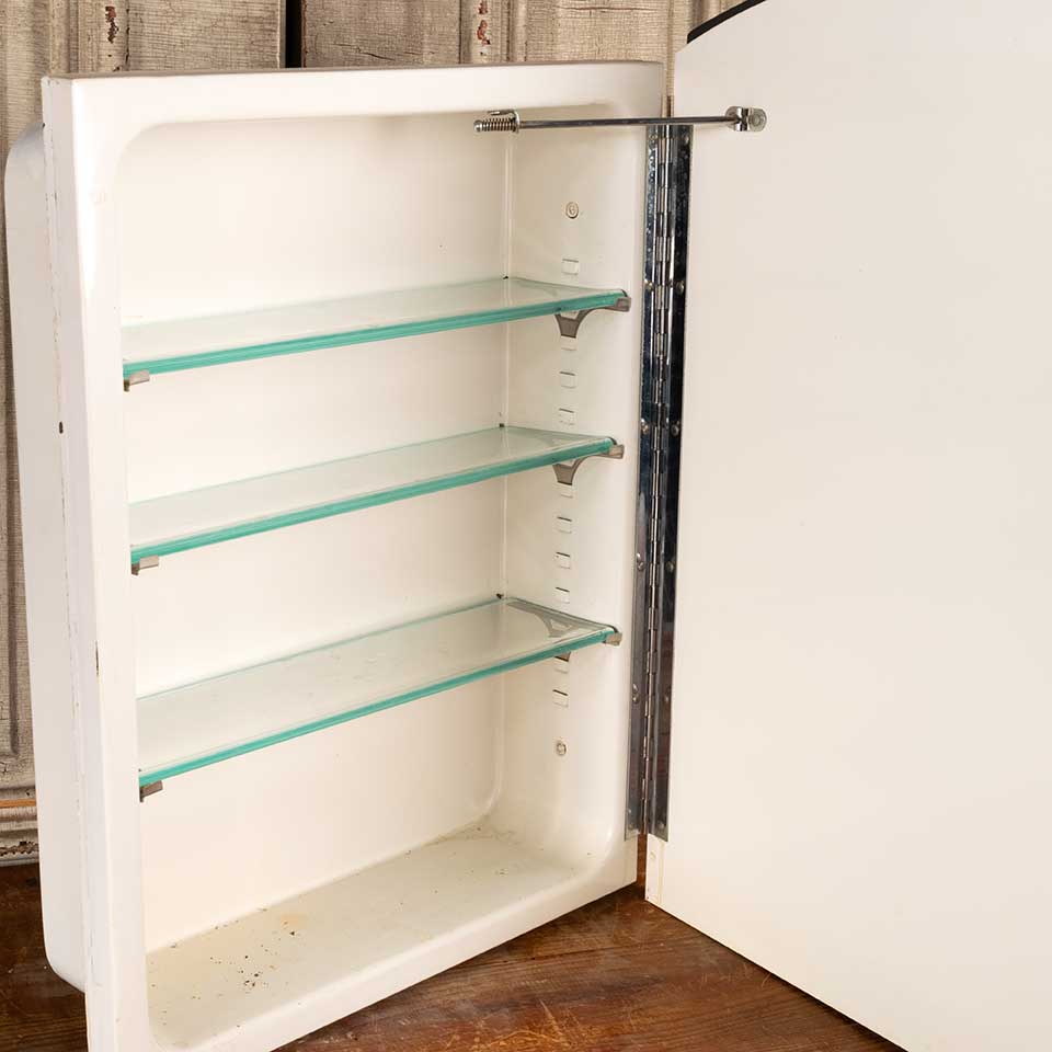 Architectural salvage vintage metal in the wall bathroom medicine cabinet with three adjustable glass shelves measuring approx. 18" wide x 25 3/4" tall x 5 3/8" front to back. See photos to evaluate condition.