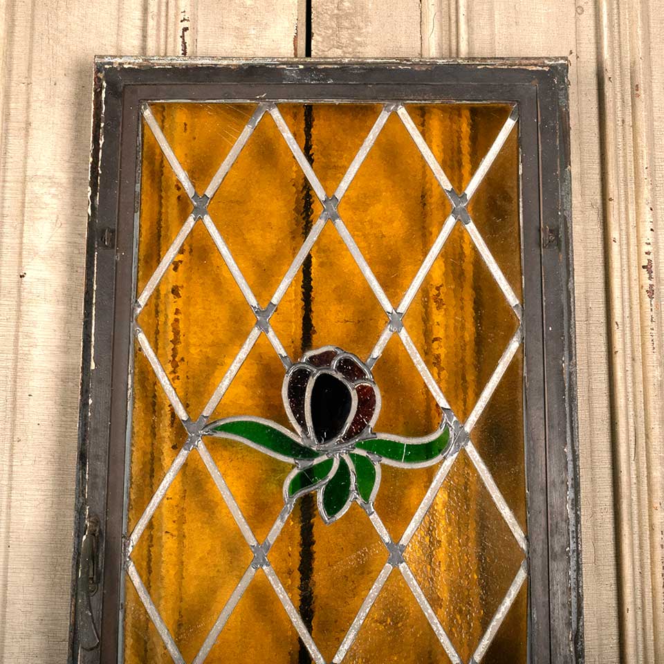 Architectural salvage antique leaded stained glass metal casement window with floral motif measuring approx. 19 3/8" wide x 39 3/8" tall x 2" front to back. The glass is slightly bowed. See photos to evaluate condition.