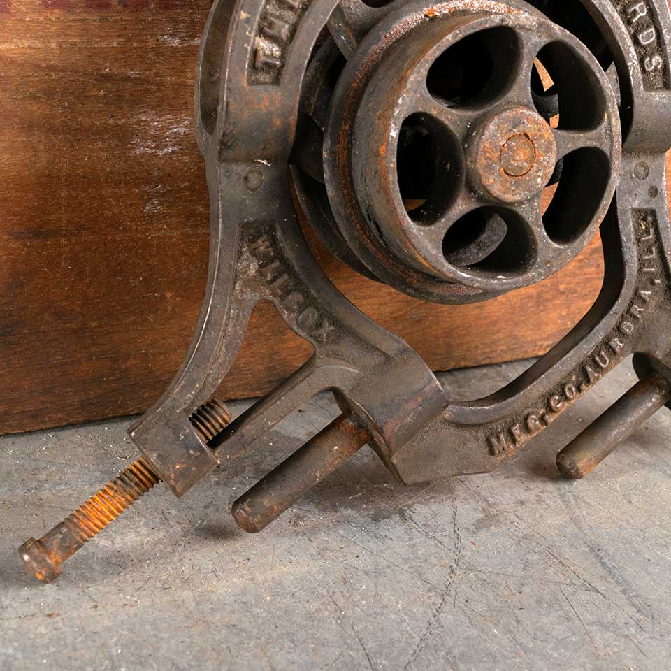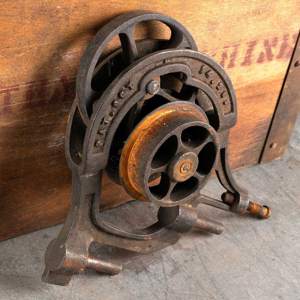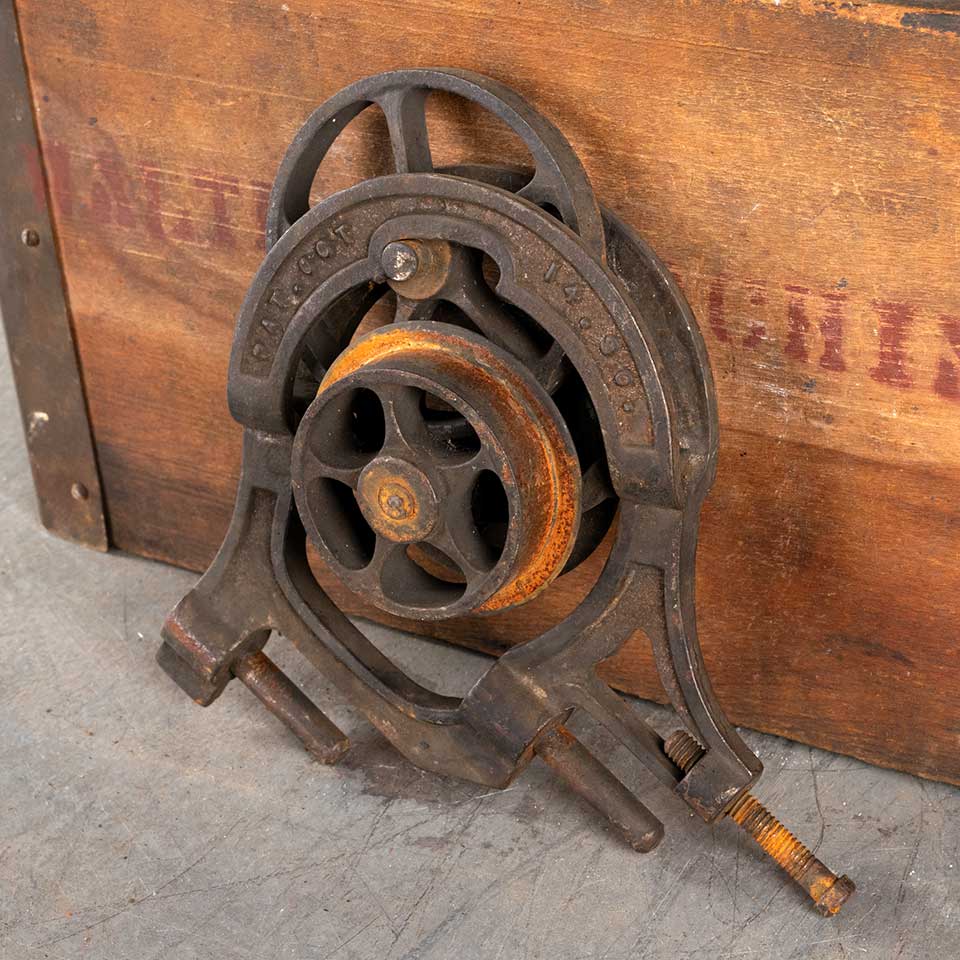 Antique architectural salvage cast iron THE NEW RICHARDS WILCOX MFG. CO. AUORA, ILL. Pat. Oct 14, 1890 pocket door roller hanger trolley hardware measuring approx. 8" wide x 7 1/4" tall x 6" tall x 2 1/2" front to back and 3" diameter functioning trolley wheel. See photos to evaluate condition.
