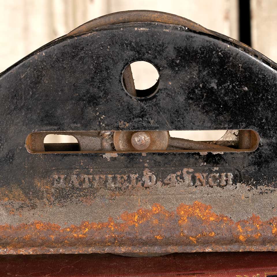 Architectural salvage antique cast iron roller pocket door trolley hardware measuring approximately 1 1/4" wide x 4 1/4" tall x 10 7/8" long with a 4" diameter functioning trolley wheel. Marked on one side HATFIELD 4 INCH and 4 INCH RUN on the other. Color and condition vary, see photos to evaluate. Priced at $95/each.