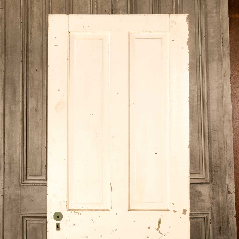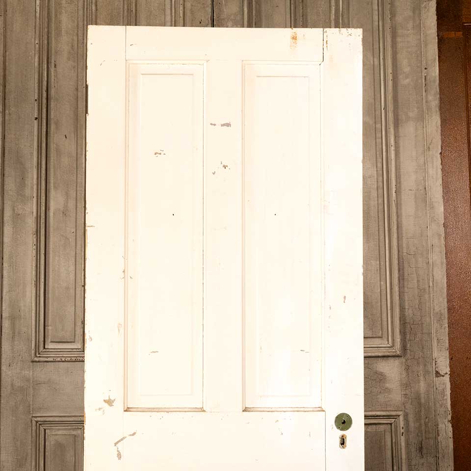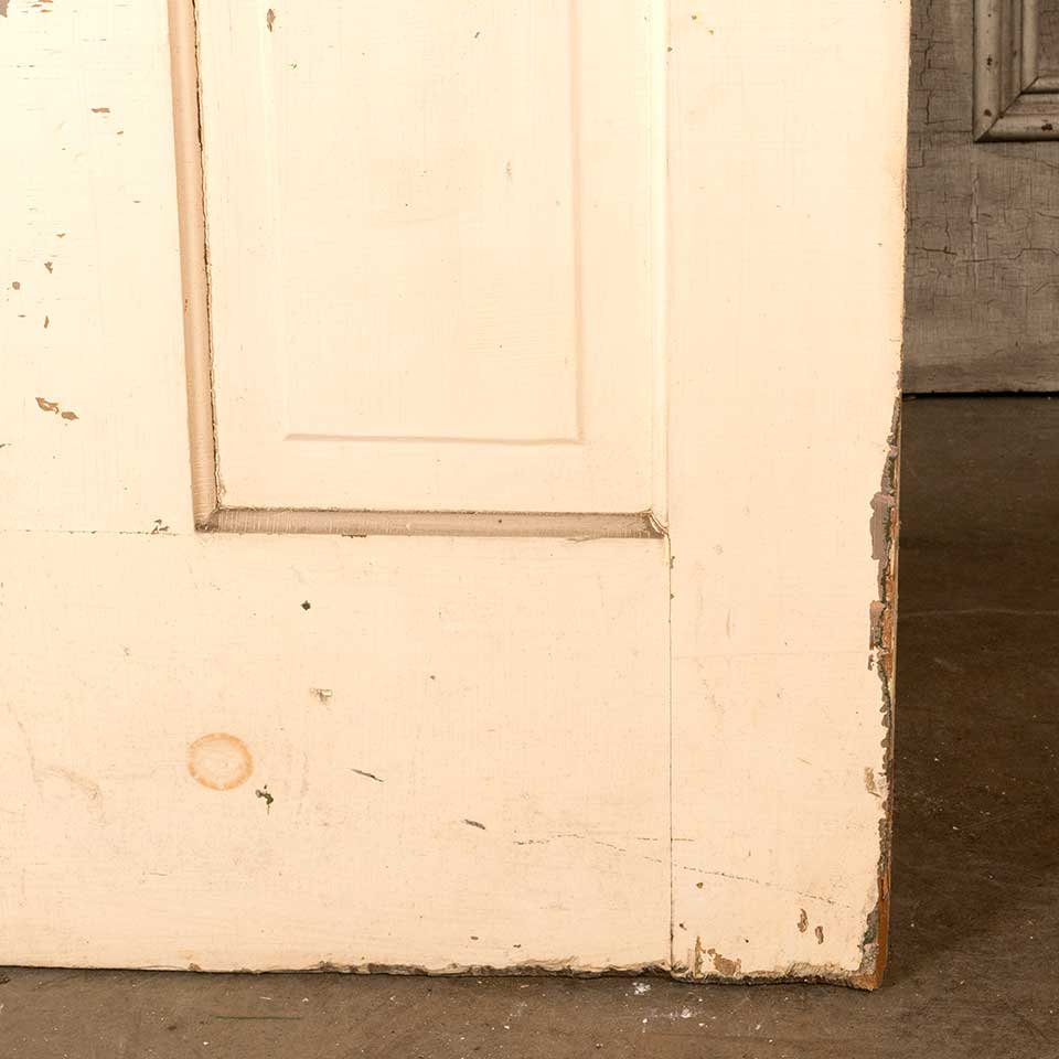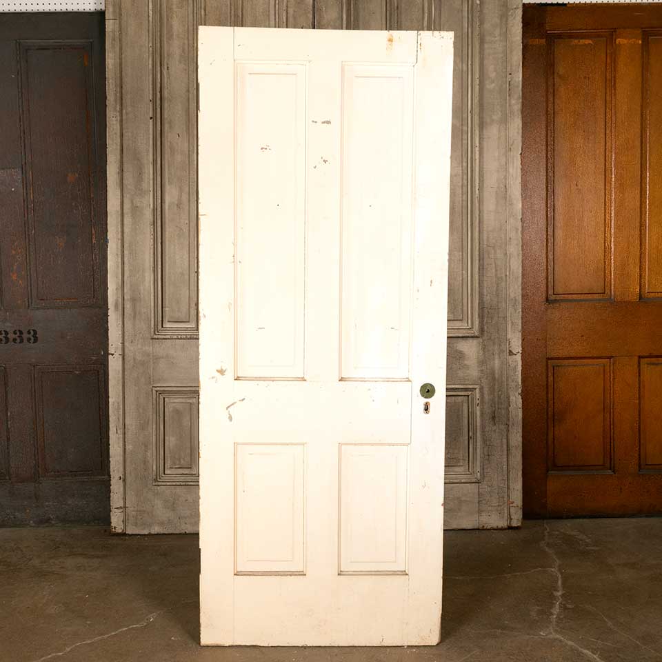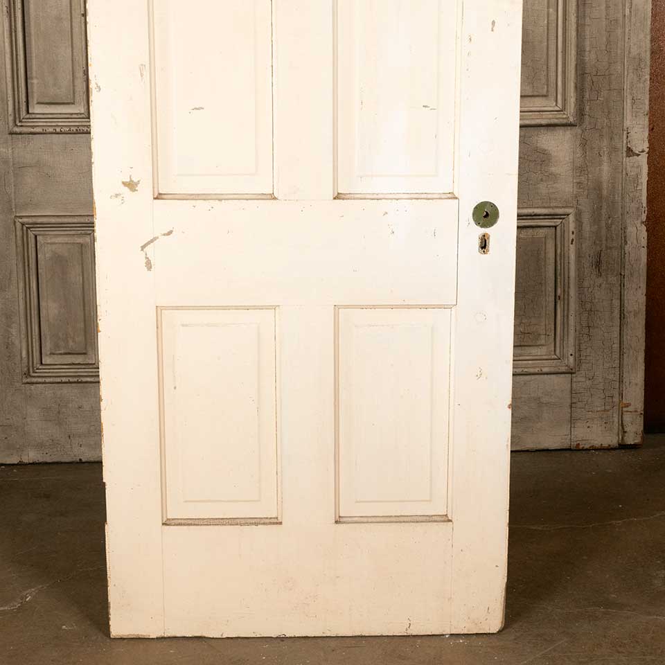 Architectural salvage antique four panel painted wood interior door measuring approx. 31 7/8" wide x 79 3/4" tall x 1 3/8" front to back. There's some wood loss at the bottom on the closing side of the door. See photos to evaluate condition.