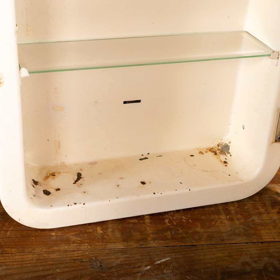 Architectural salvage vintage metal in the wall bathroom medicine cabinet with two glass shelves measuring approx. 16" wide x 22" tall x 4 3/4" front to back. The in wall box measures approx. 13 1/8" wide x 19 1/8" tall x 3 1/8" front to back. See photos to evaluate condition.