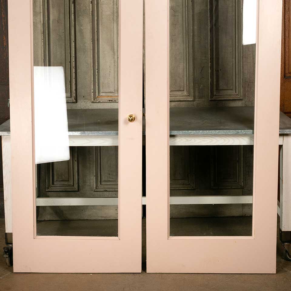Architectural salvage full-view wood entry doors with hardware measuring approx. 59 3/4" wide x 89 5/8" tall x 1 3/4" thick. These are not antique doors. See photos to evaluate condition. Priced at $2,500 for the pair.