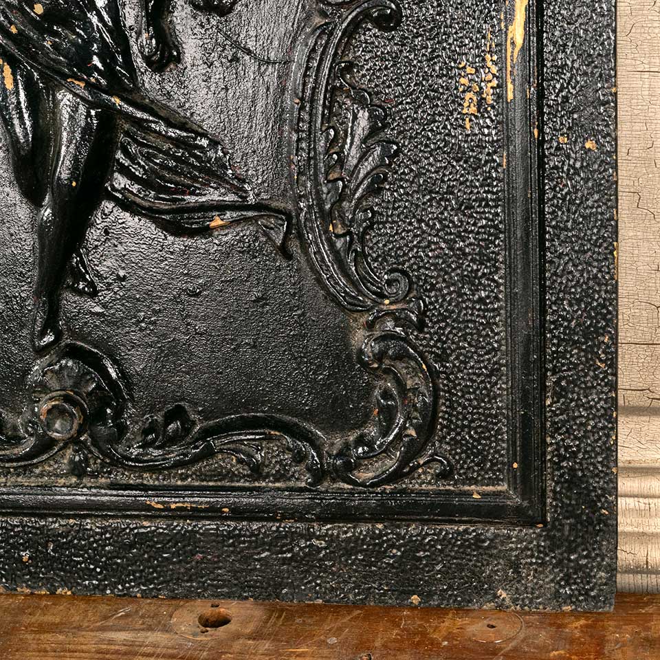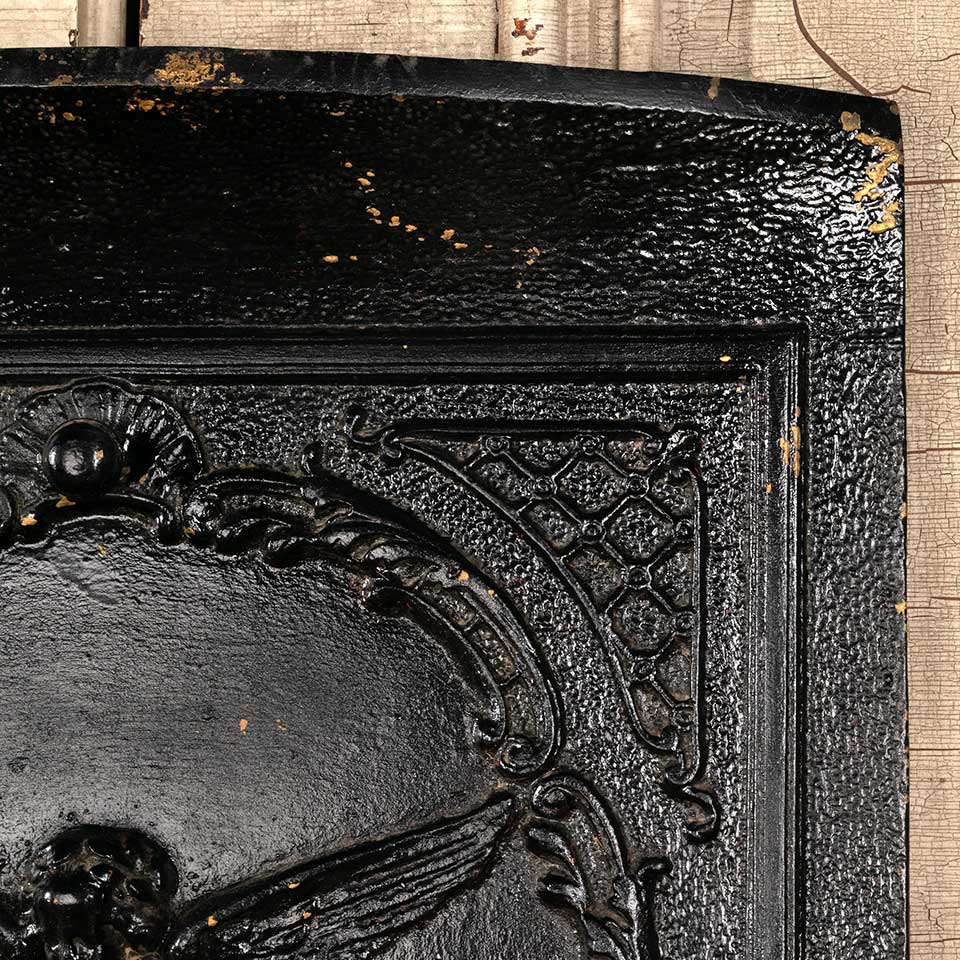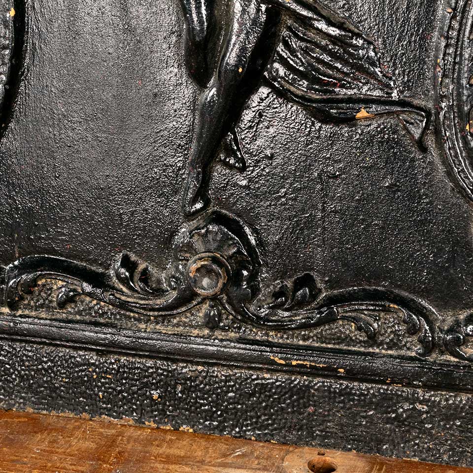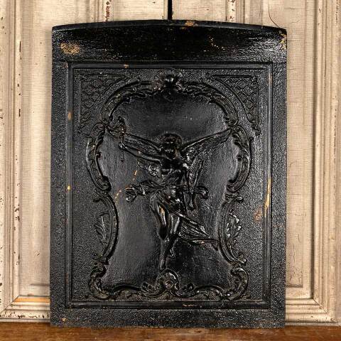 Architectural salvage antique cast iron fireplace summer front cover with angel motif measuring approx. 20" wide x 25 7/8" tall (at top center) x 2 1/4" front to back. See photos to evaluate condition.