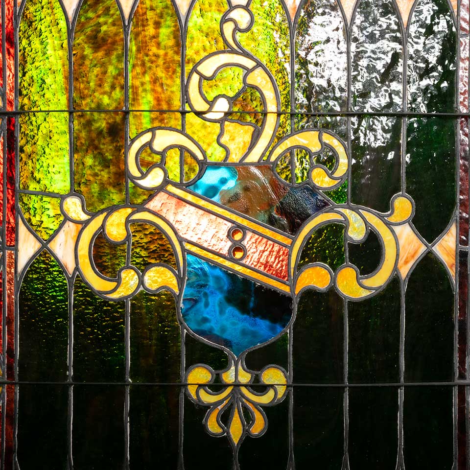 Architectural salvage antique stained glass window panel in wood frame measuring approx. 35 1/2" wide x 44 7/8" tall x 1 11/16" thick. There's some minor cracking in the glass, but all intact. See photos to evaluate condition.
