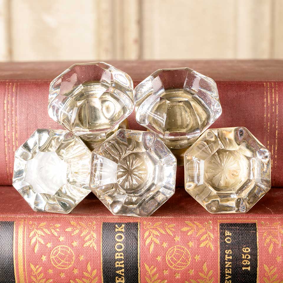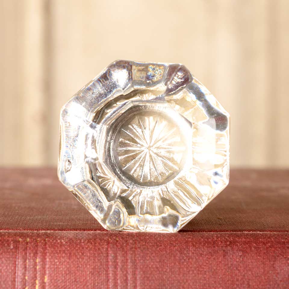 Architectural salvage antique octagonal clear pressed glass furniture drawer / cabinet knob hardware with brass collar measuring approx. 1 3/8" in diameter x 1 1/2" front to back. Mounting screw NOT included. Color and condition may vary.