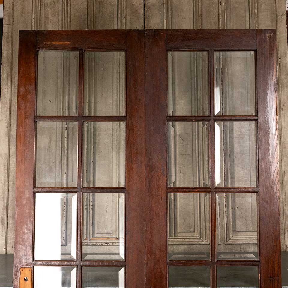 Architectural salvage antique oak bi-fold ten lite interior French doors with beveled glass panels together measuring approx. 48 7/8" wide x 80 11/16 - 81 1/4" tall (probably cut to match an uneven floor) x 1 3/4" thick. Includes a mortise lock and hinges. See photos to evaluate condition. Priced at $1,950 for the set.