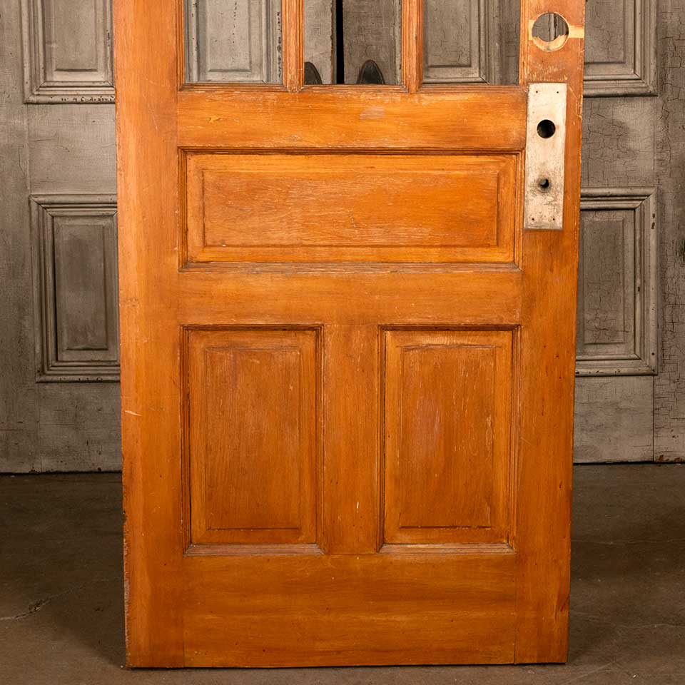 Architectural salvage antique six lite wood entry door measuring approx. 31 5/8" wide x 79 1/4" tall x 1 3/4" thick. Two panes of glass are missing. See photos to evaluate condition.