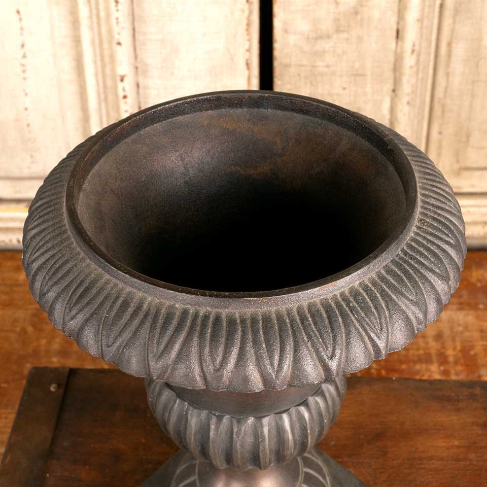 Architectural salvage small cast aluminum planter urn measuring approx. 7 1/2" in diameter x 9 3/4" tall with a 4" square base. See photos to evaluate condition.