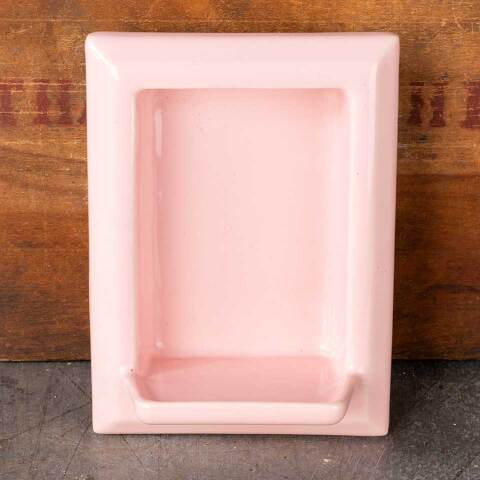 Architectural salvage vintage pink in-the-wall bathroom soap dish niche measuring approx. 4 3/4" wide x 6 1/2 tall x 3" front to back. See photos to evaluate condition.