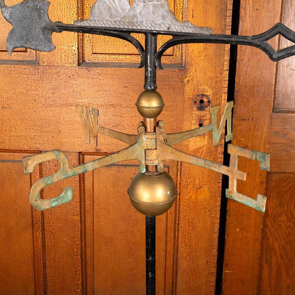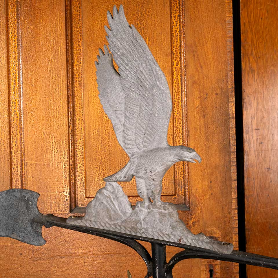 Architectural salvage vintage cast aluminum eagle weathervane with directional arrows on cast iron Grand Army of the Republic flag pole stand measuring approx. 17 3/4" wide x 54 1/2" tall x 23 3/8" front to back. See photos to evaluate condition.