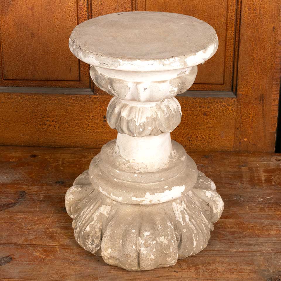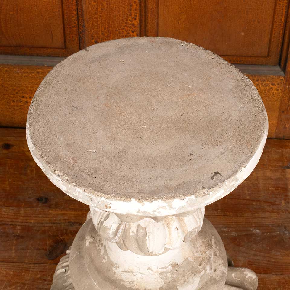 Architectural salvage vintage cast concrete garden pedestal base measuring approx. 20 1/2" tall with a 12 3/4" diameter top and a 15 1/2" diameter base. See photos to evaluate condition.
