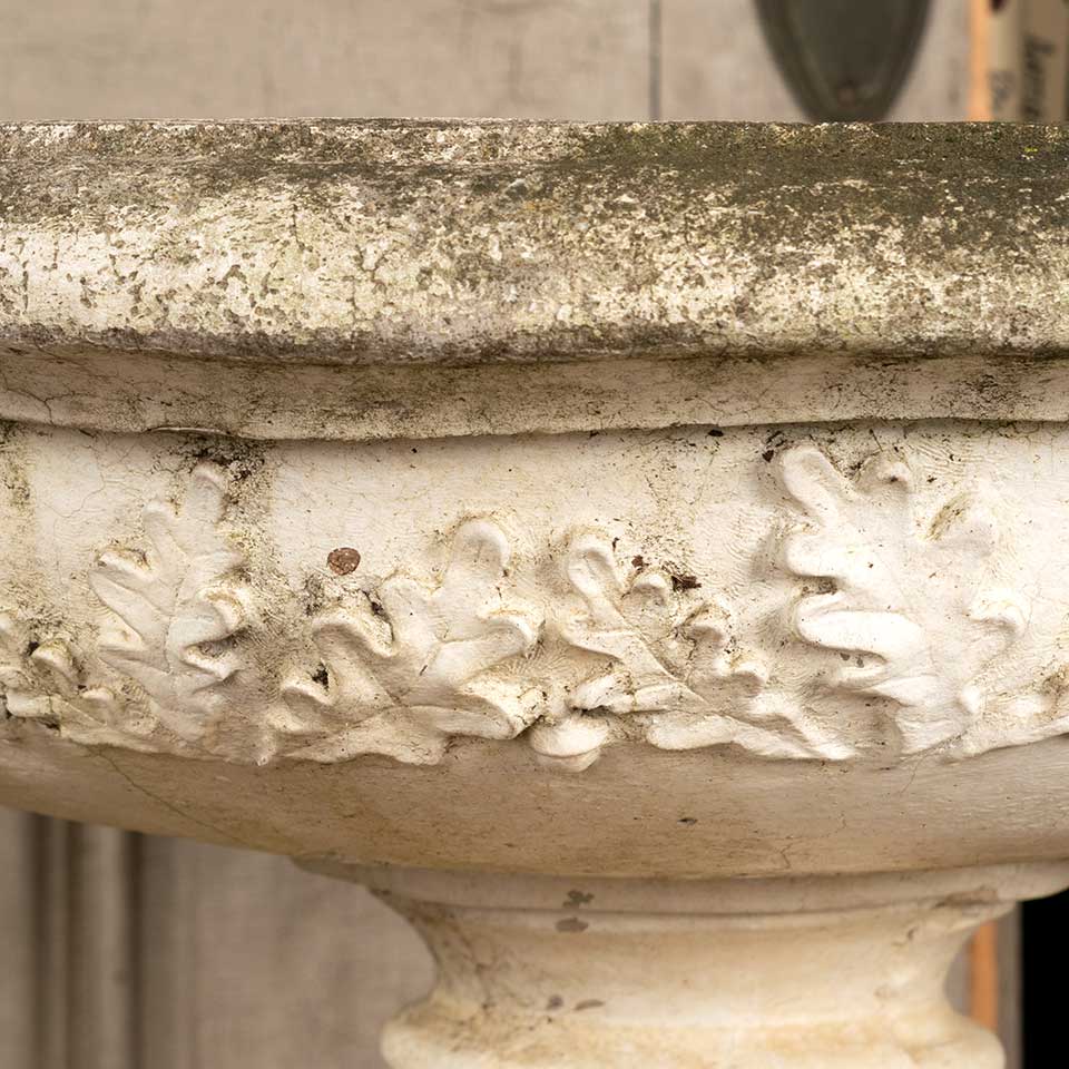 Architectural salvage wide mouth cast concrete garden urn planter (approx. 22" in diameter x 12 1/2" tall with an 8" square base) and pedestal base (approx. 9" tall with a 12" square base and a 10" square top). The base is marked 1990 Henri Studio INC. Wauconda 8810. See photos to evaluate condition. Priced at $450 for the two piece set.