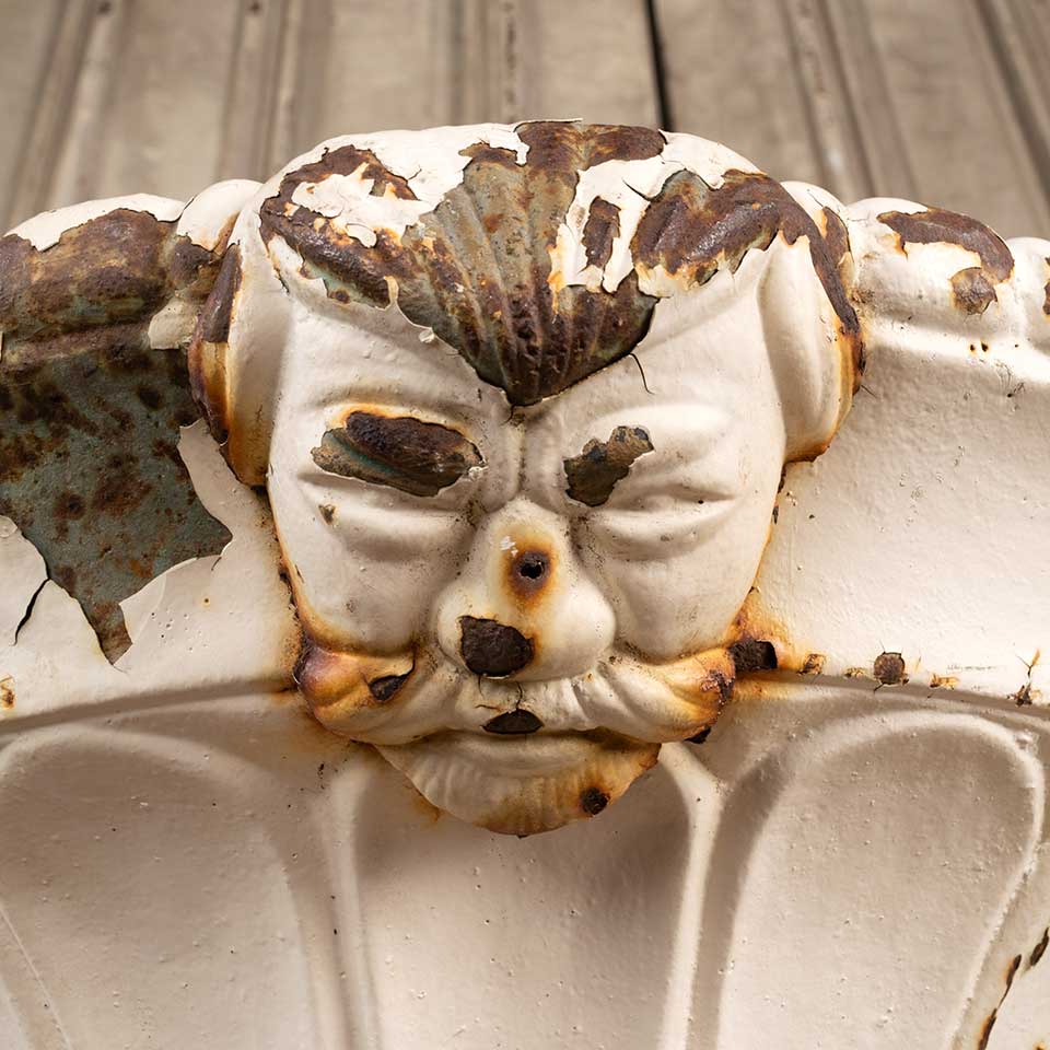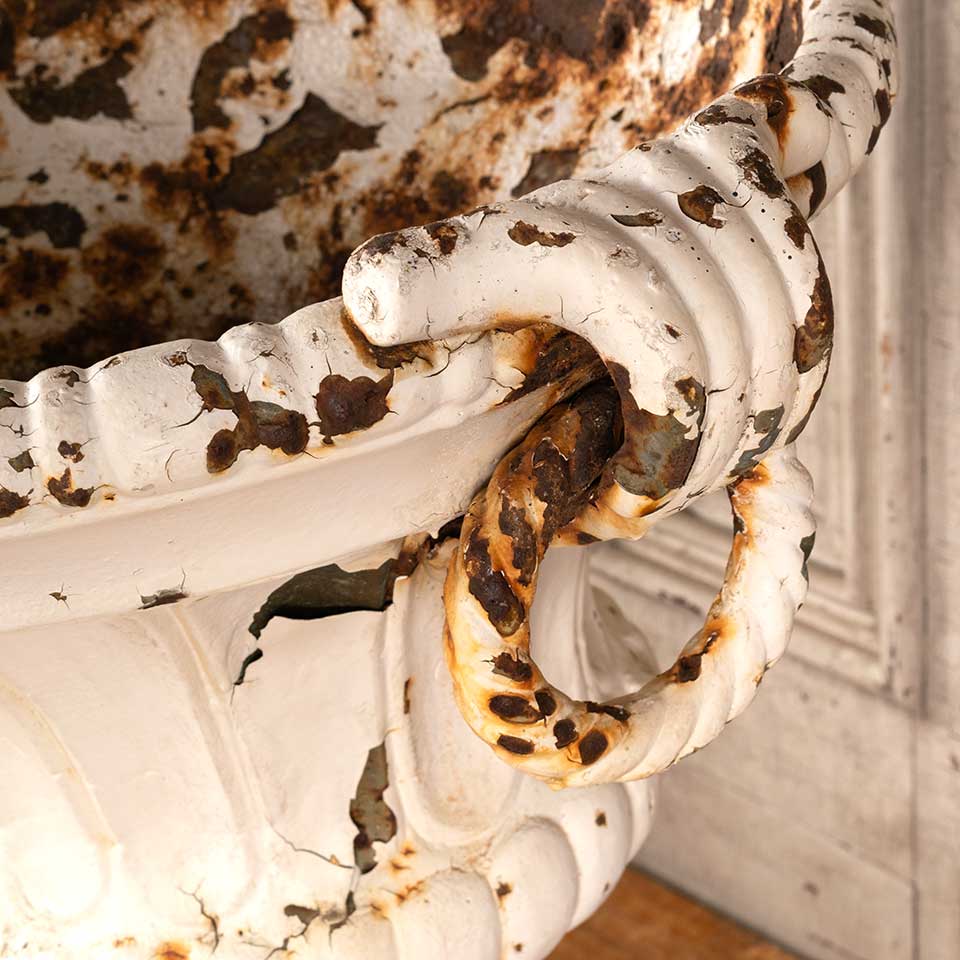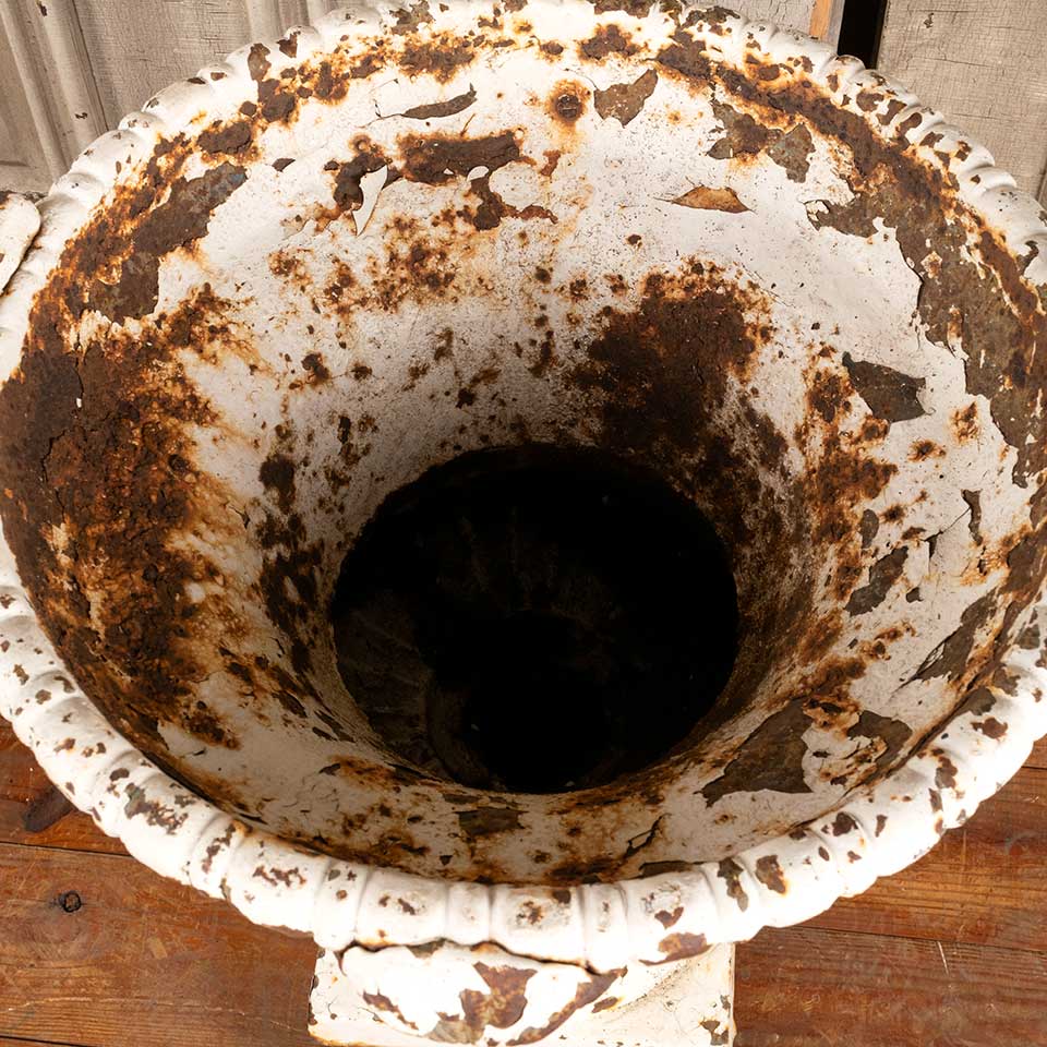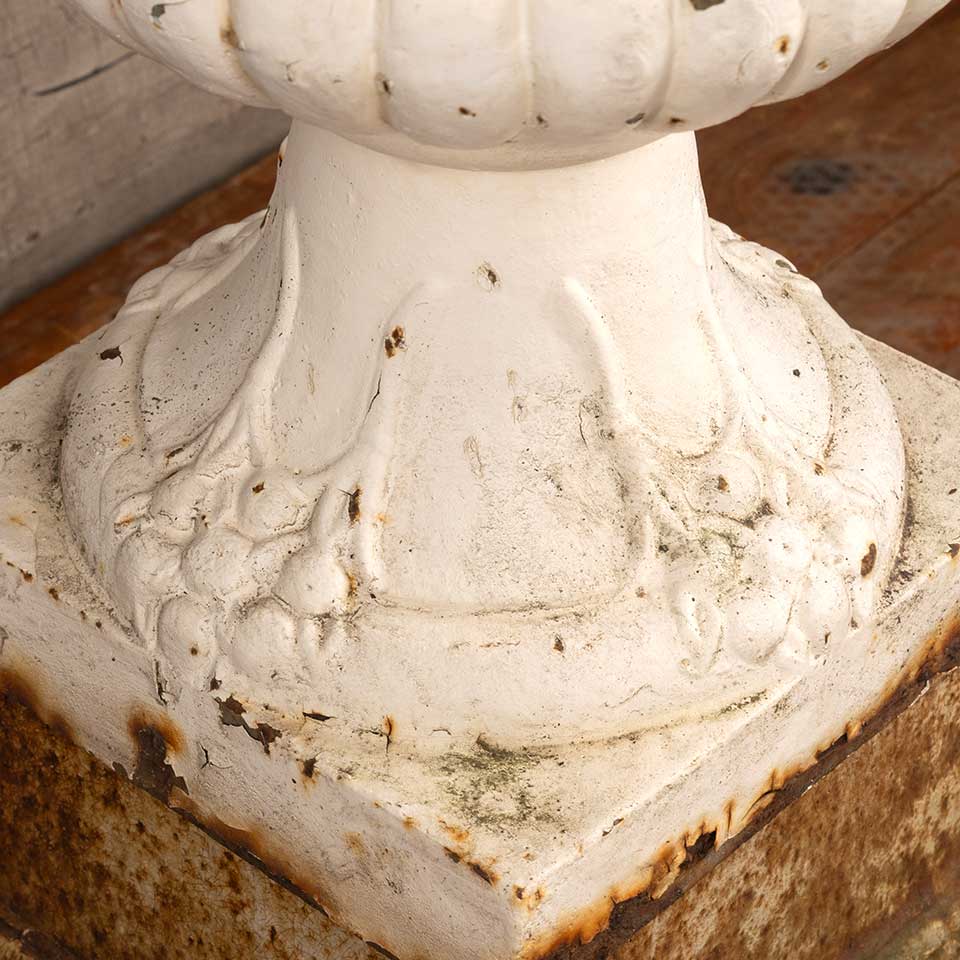 Architectural salvage painted cast iron garden patio planter urn with ring handles measuring approx. 20" wide x 26 1/2" tall (overall) with a 10" square pedestal base. See photos to evaluate condition.