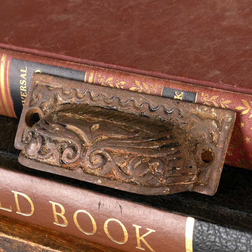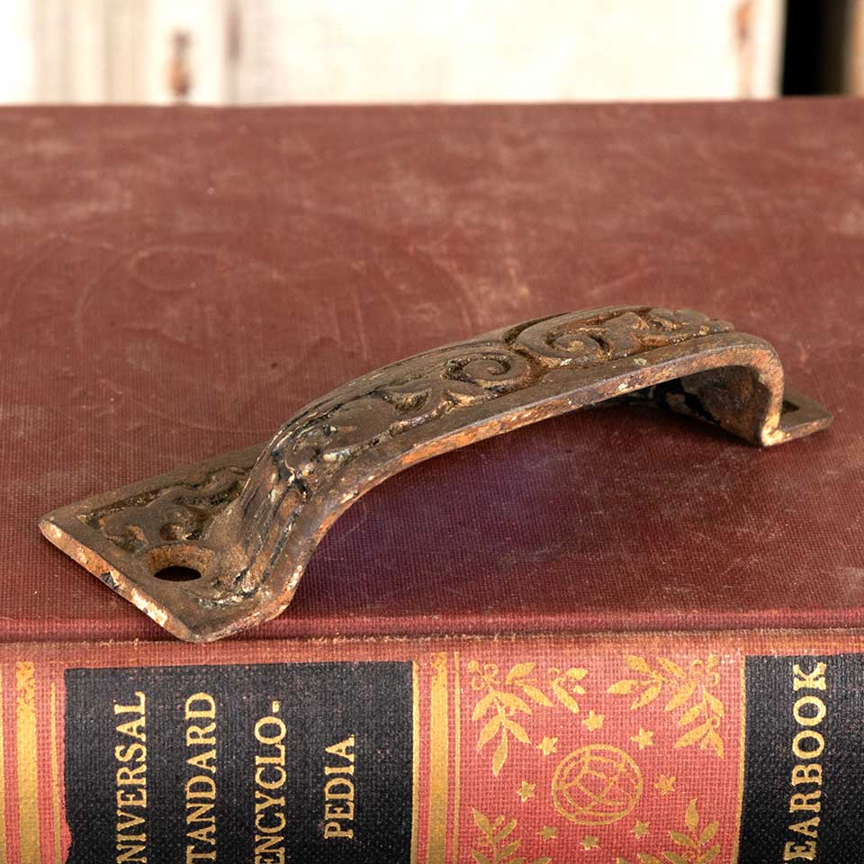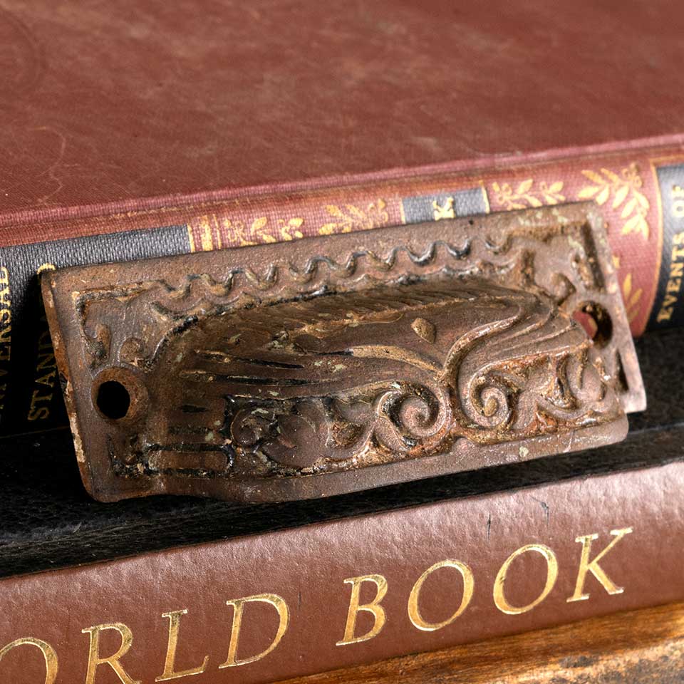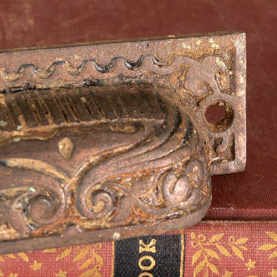 Architectural salvage antique ornate cast iron drawer bin pull handle hardware measuring approx. 3 1/4" wide x 1 1/4" tall x 3/4" front to back with mounting holes 3" on center. See photos to evaluate condition.