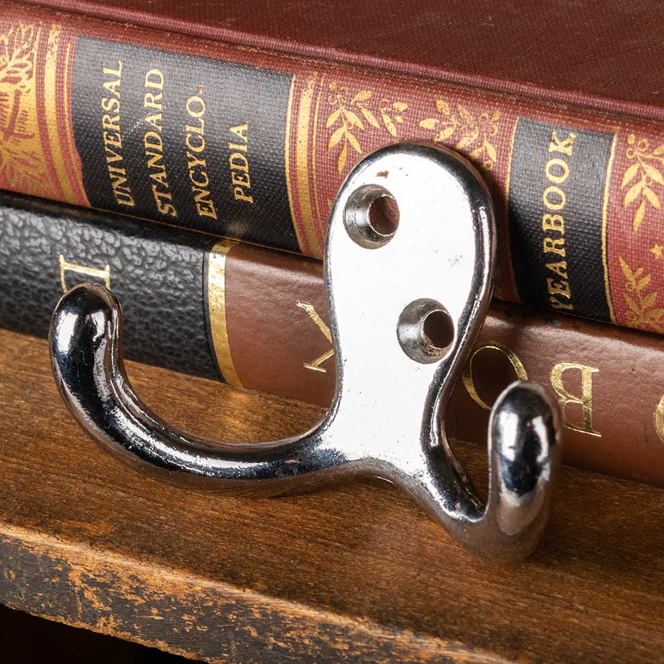 Architectural salvage chrome plated brass wall mount double coat hook hardware measuring approx. 2 3/4" wide x 1 2" tall x 7/8" front to back. Color and condition may vary. Priced at $5/each.