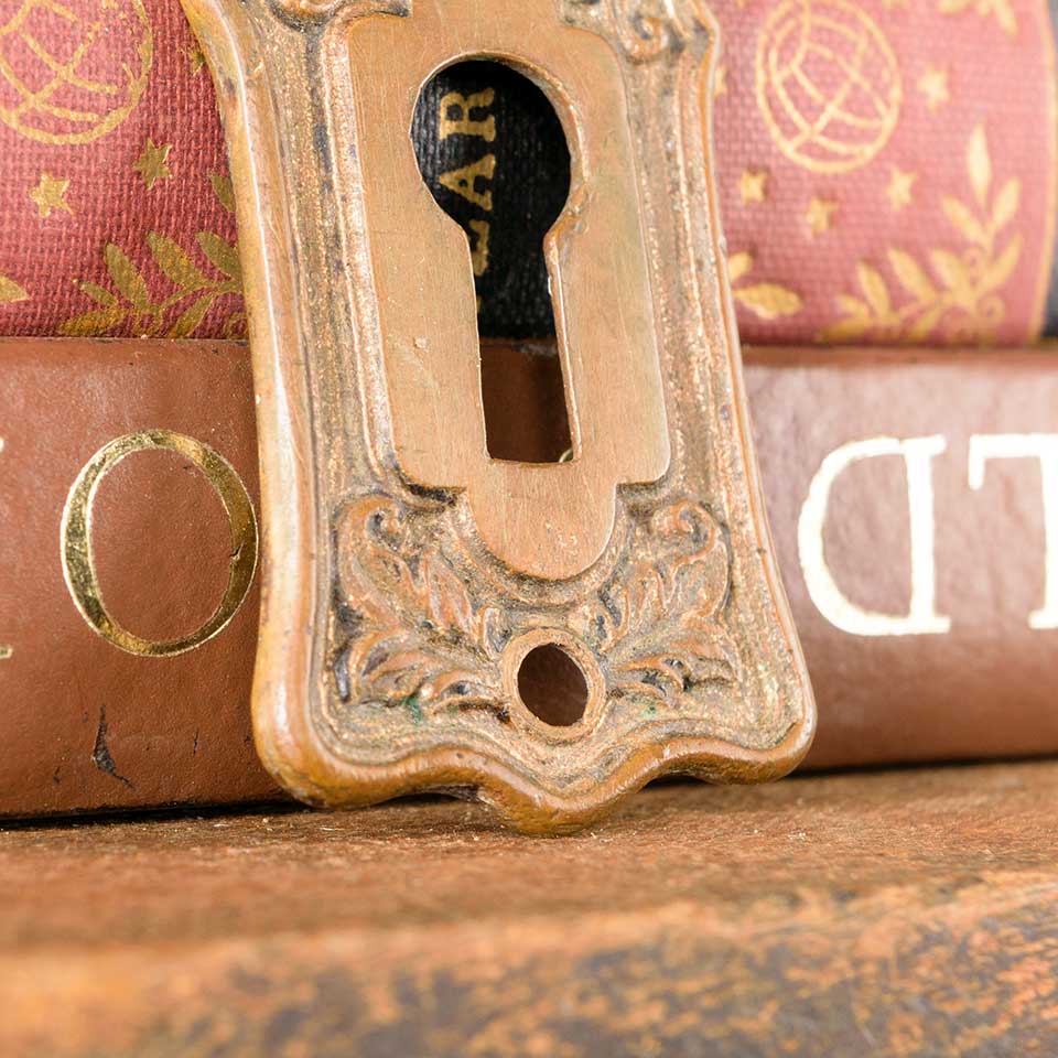 Architectural salvage ornate antique bronze Lockwood (Oakdale pattern c.1914) door skeleton keyhole escutcheon cover plate hardware measuring approx. 1 1/8" x 2 1/4" x 1/16" thick. See photos to evaluate condition.