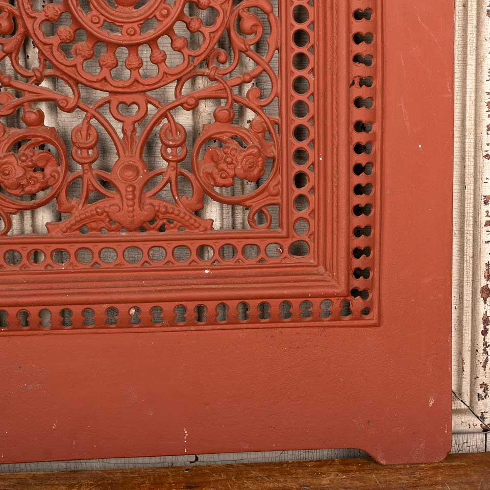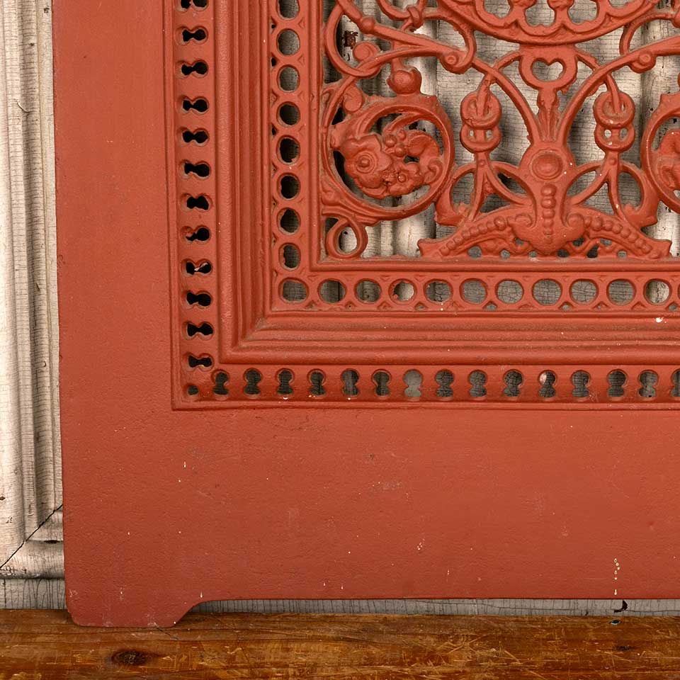 Architectural salvage antique cast iron fireplace summer front cover measuring approx. 20" wide x 27 1/8" tall x 1" front to back. See photos to evaluate condition.