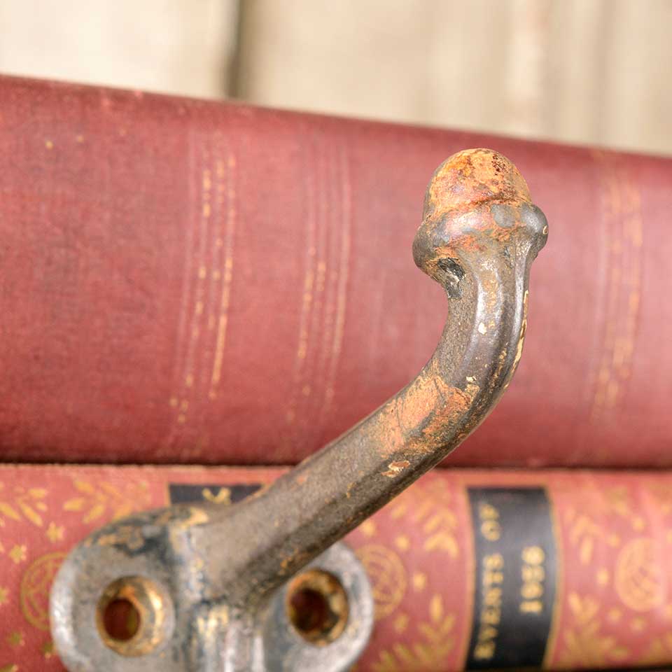Architectural salvage antique cast iron double acorn finial coat and hat hook hardware measuring approx. 1 3/4" wide x 3" tall x 2 7/8" front to back. Color and condition may vary.
