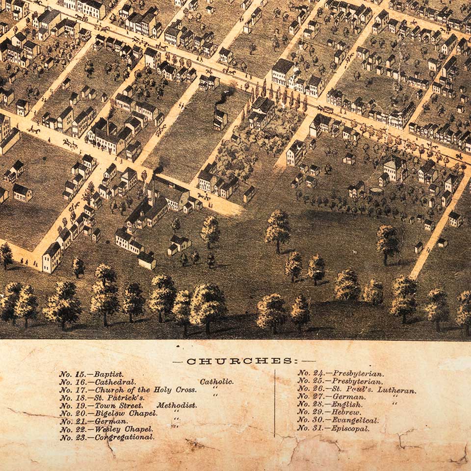 Bird's Eye View of Columbus, Ohio 1872 poster print on heavy coated bond paper measuring 36" wide x 24" tall. Poster only, frame not included.