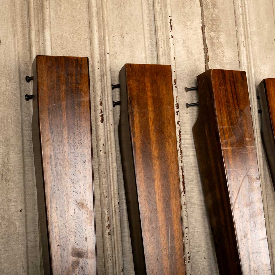 Salvaged tapered wood table legs each measuring approx. 35 1/8" tall with a 4 1/2" square top and 3" square base. See photos to evaluate condition. Priced at $175 for the set.