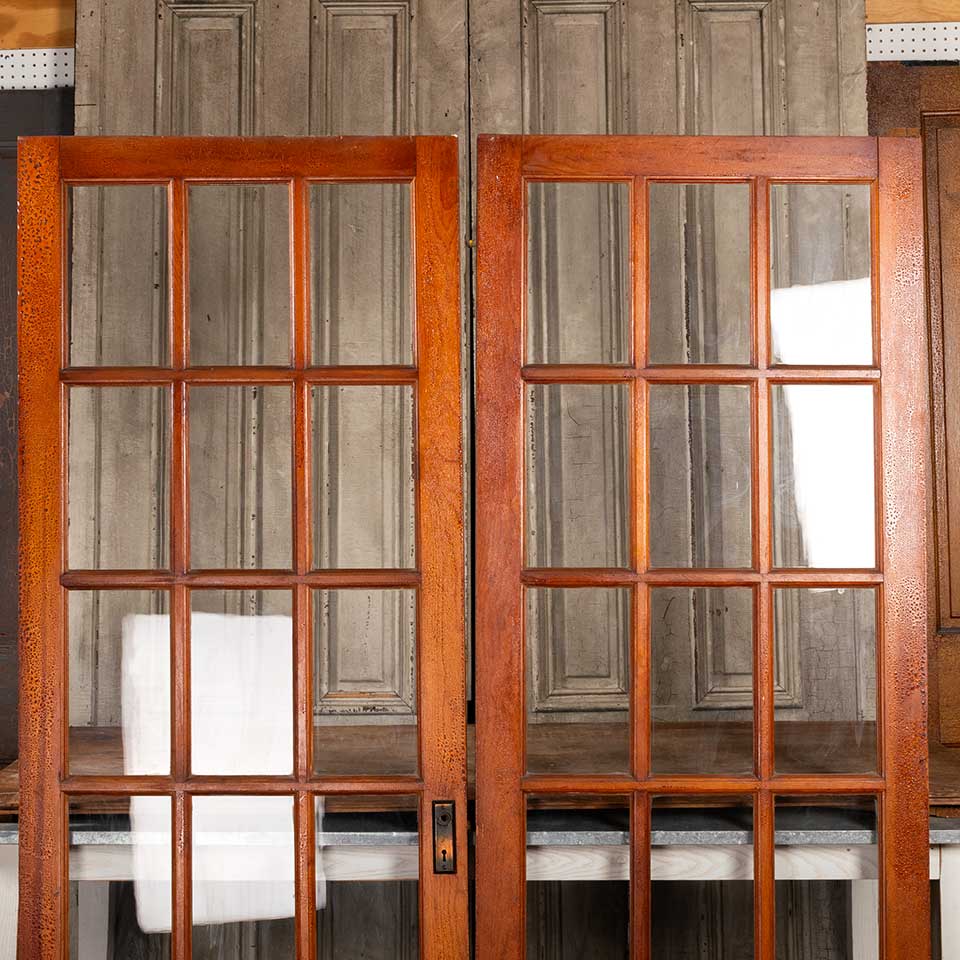 Pair of architectural salvage antique pine wood 15 lite interior French doors together measuring approx. 60" wide x 79 3/4" tall x 1 3/8 thick. See photos to evaluate condition. Priced at $1,100 for the pair.