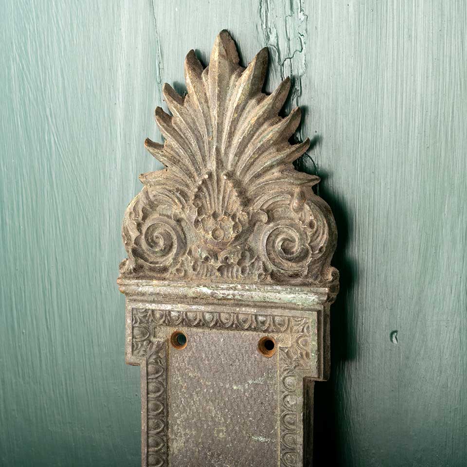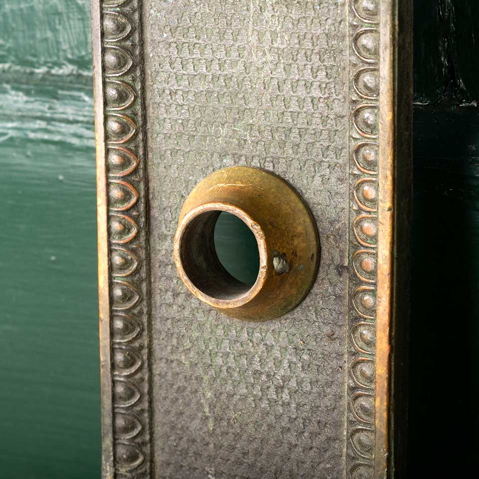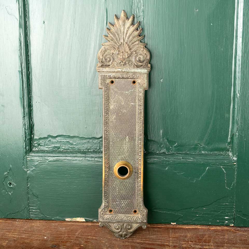 Architectural salvage antique ornate cast bronze Greek Revival doorknob backplate door hardware measuring approx. 3 5/8" wide x 15 1/4" tall x 1/4" front to back with a 3/4" diameter brass collar. This hardware was salvaged from the Ohio Statehouse in Columbus, Ohio during it's last major renovation. See photos to evaluate condition.