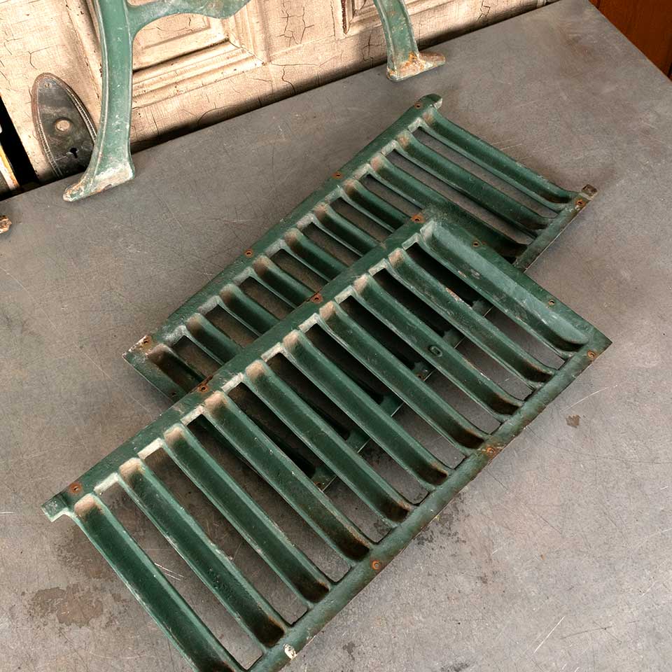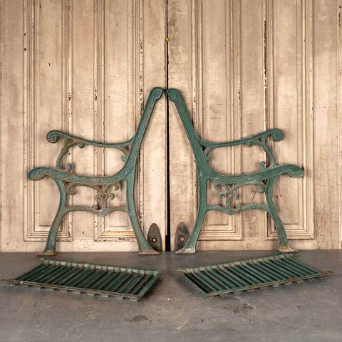 Pair of architectural salvage cast iron garden / park bench ends each measuring approx. 1" wide x 32 1/2" tall x 23 1/2" front to back. The set includes two slatted metal back pieces. See photos to evaluate condition. Priced at $150 for the set.