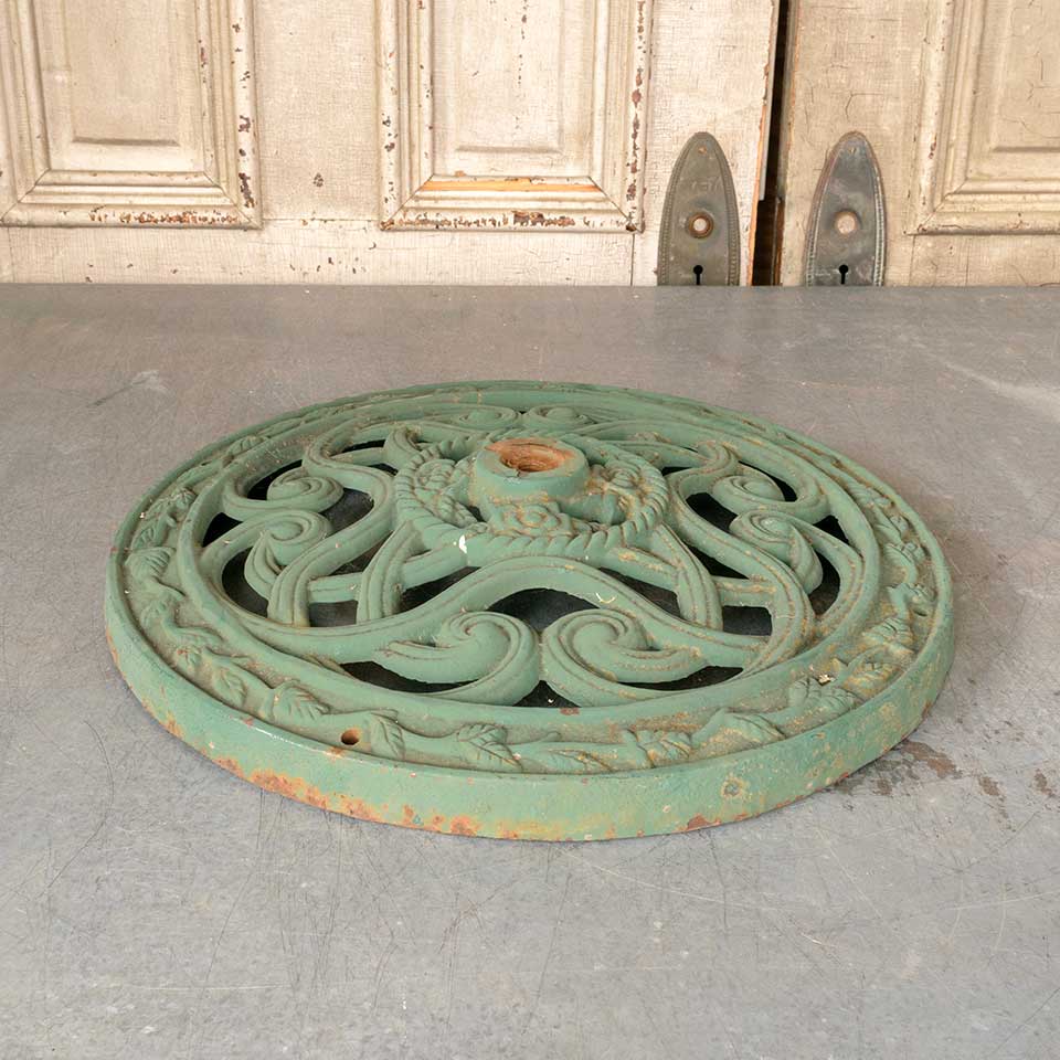 Architectural salvage ornate round painted cast iron base measuring approx. 18 3/8" in diameter x 2 1/4 " tall with a 1/2" diameter threaded hole in the middle. See photos to evaluate condition.