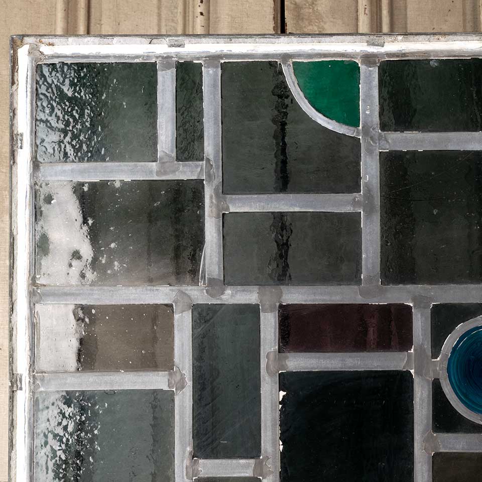 Architectural salvage vintage mid-century modern stained glass window panel with rondels measuring approx. 23 1/4" wide x 31" tall x 3/4" thick. There are two cracked panes. See photos to evaluate condition.