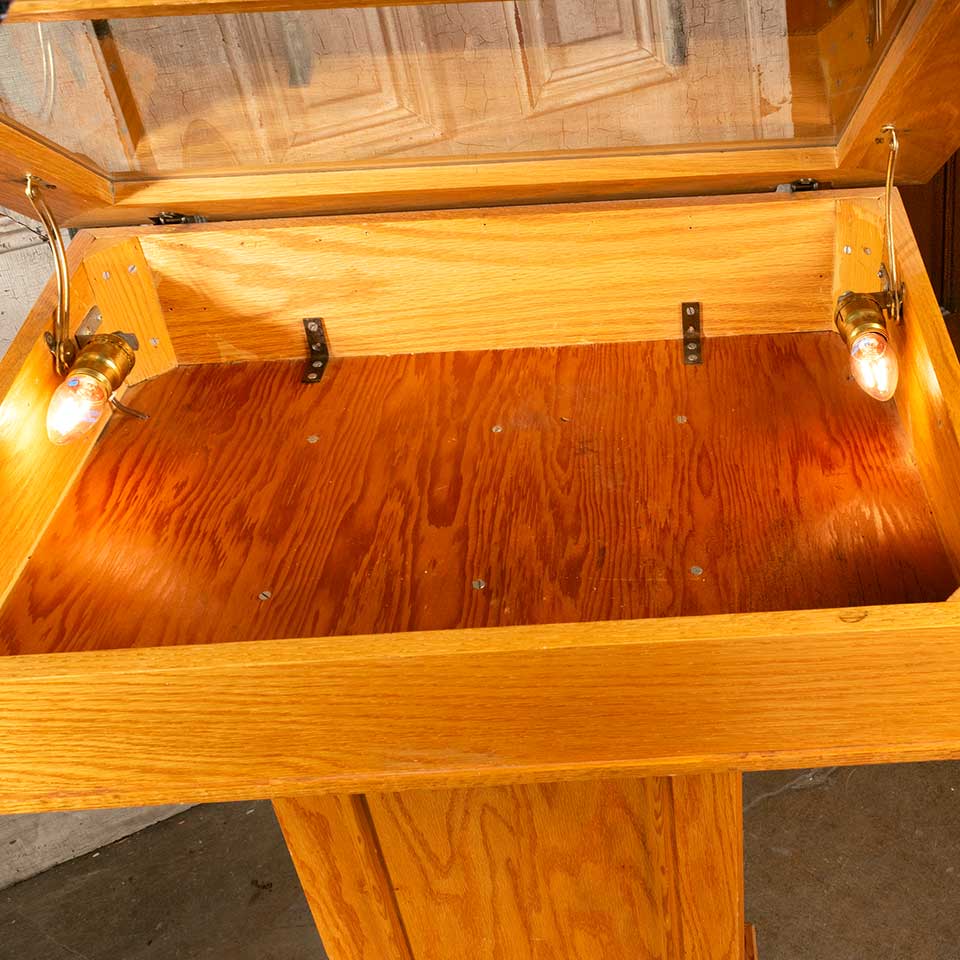 Architectural salvage oak podium stand display case with hinged framed glass top measuring approx. 30" wide x 42 1/2" x 22" front to back. There are lights on either side of the interior. See photos to evaluate condition.