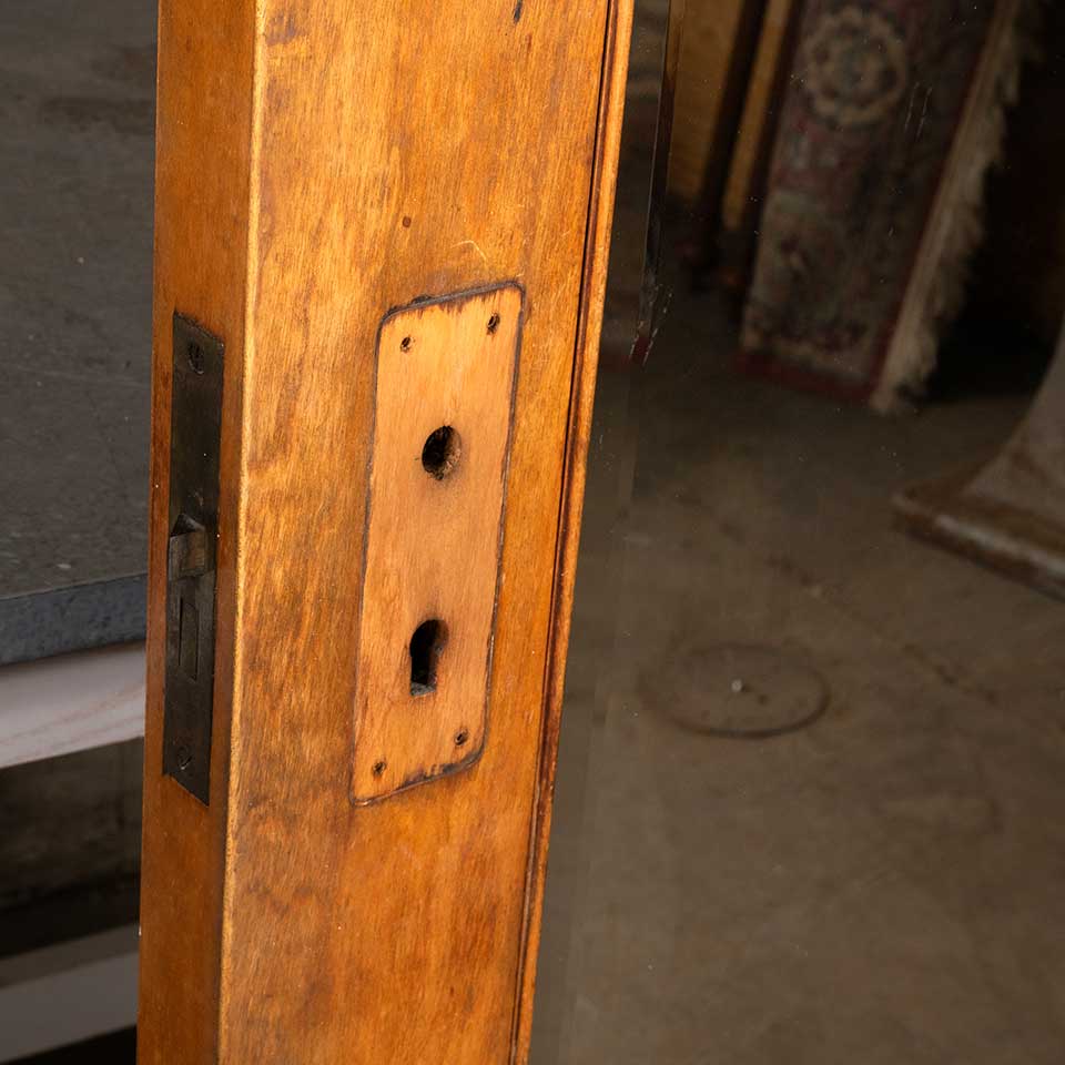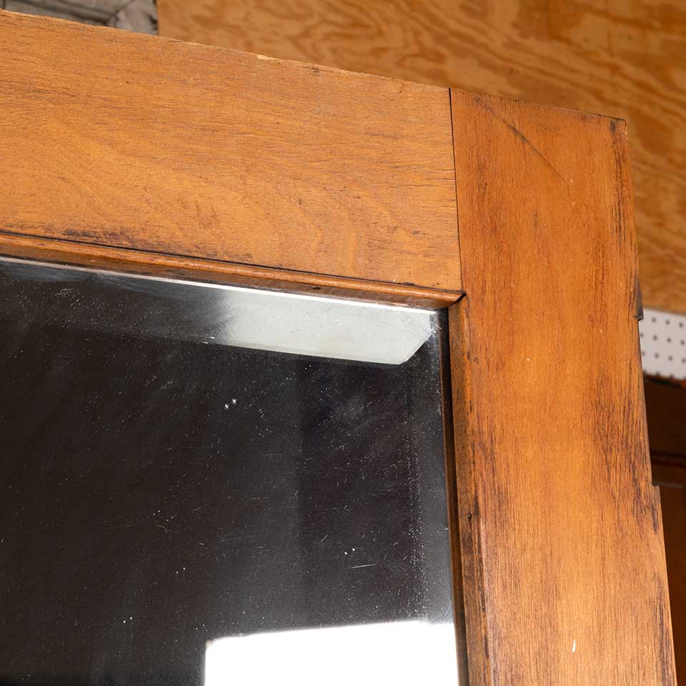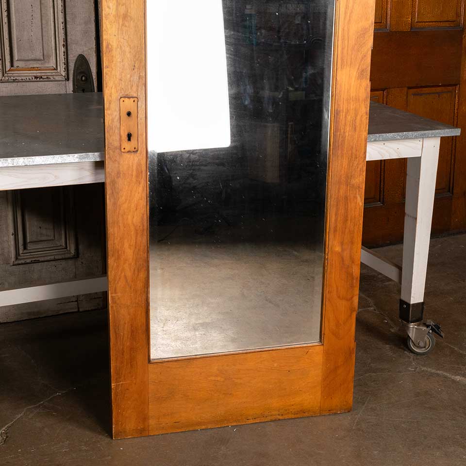 Architectural salvage antique two panel wood interior door with beveled glass mirror and mortise lock measuring approx. 29 5/8" wide x 79 1/2" tall x 1 3/4" thick. See photos to evaluate condition.
