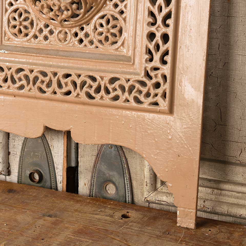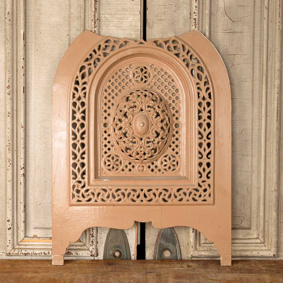 Architectural salvage antique ornate arched top painted cast iron fireplace summer front cover measuring approx. 18 7/8" wide x 25" tall x 2" front to back. A large section of the top is missing. See photos to evaluate condition.