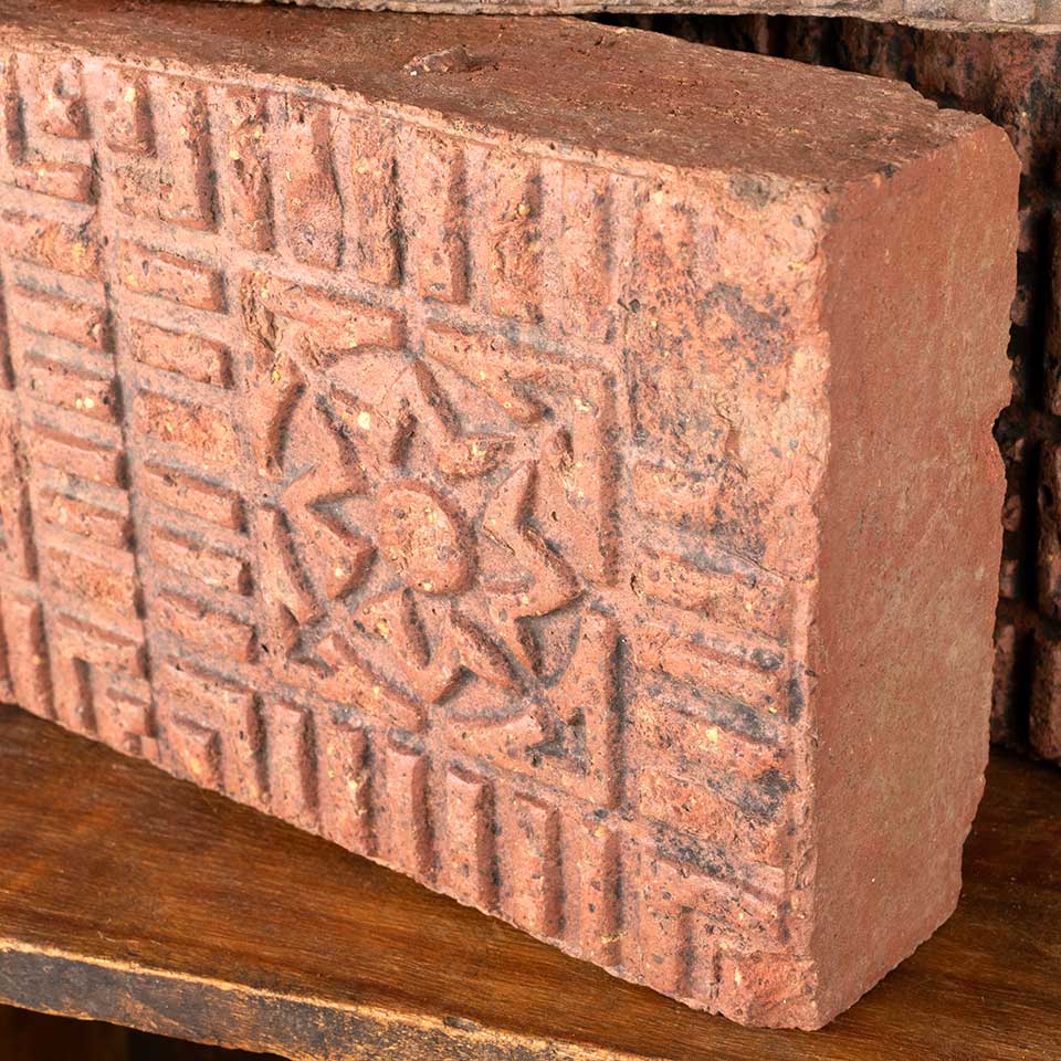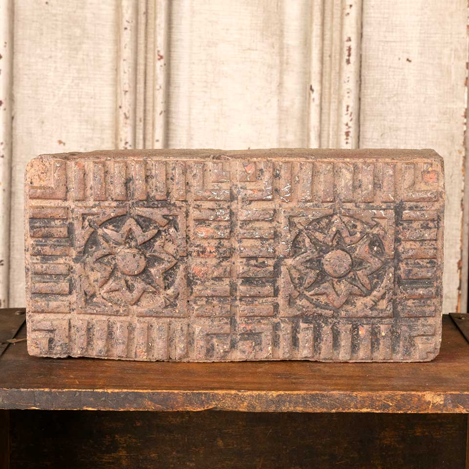 Architectural salvage antique salt glazed flower pattern sidewalk paver measuring each approx. 5" x 10" x 2 1/2" tall. Color and condition vary. Priced at $15/each.
