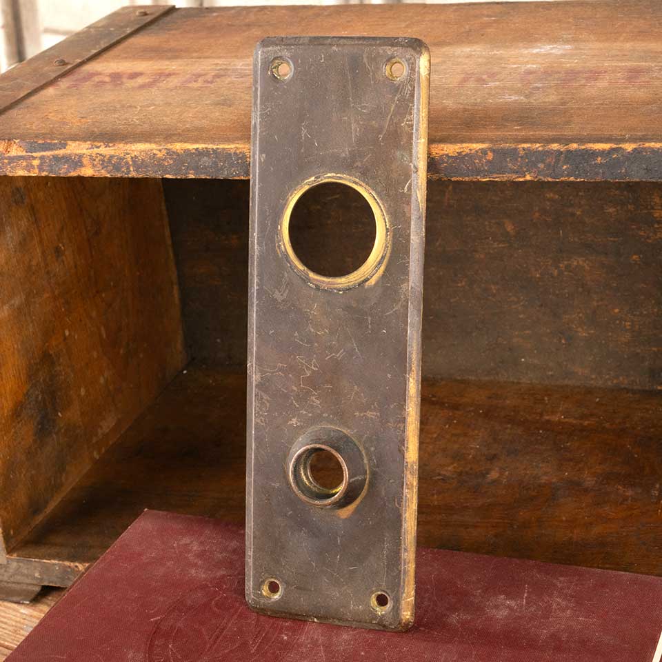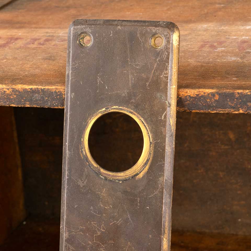Architectural salvage antique brass entry doorknob backplate hardware with deadbolt cylinder lock hole measuring approx. 2 1/2" wide x 8" tall with a 3/4 collar. Distance between spindle hole and cylinder lock hole is 3 1/2" on center. Color and condition vary, see photos to evaluate. Priced at $25/each.