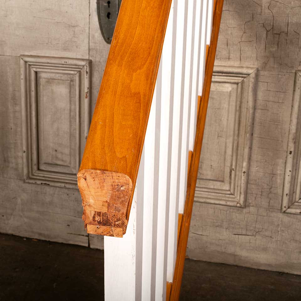 Architectural salvage interior wood staircase balustrade measuring approx. 61 1/2" long (long point to long point) x 34" tall (on the angle) x 3 1/8" wide. See photo to evaluate condition.