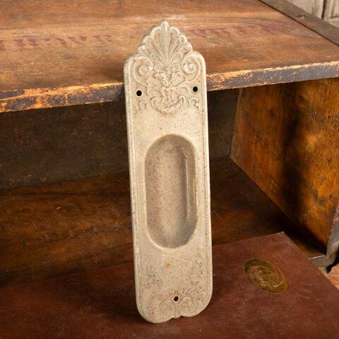 Architectural salvage single antique ornate stamped metal pocket door pull handle hardware measuring approx. 2 1/4" wide x 8 1/4" tall with the recessed area measuring 1 1/2" wide x 3 1/8" tall. There's surface rust on this piece. See photos to evaluate condition.