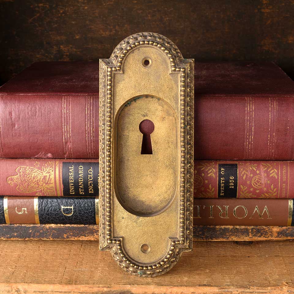 Architectural salvage antique cast brass single pocket door pull handle hardware with an ornate decorative border and keyhole measuring approx. 2 1/2" wide x 6 3/8" tall x 5/8" front to back with a recessed area of 1 3/4" wide x 3 1/4" tall. See photos to evaluate condition.